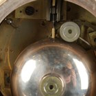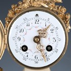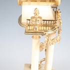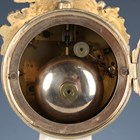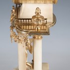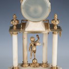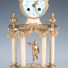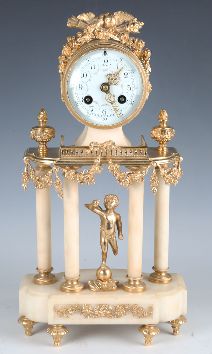 A late19th/early 20th century gilt brass and alabaster portico mantel clock with eight day movement striking on a bell via an outside countwheel, the white enamelled dial with black Arabic hour numerals and floral garlands, the drum shaped case with a two dove, torch and quiver surmount above urn finials, floral festoons and a figure of Cupid framed by four turned columns, on a breakfront base and toupie feet, height 39cm, with mask and sunburst pendulum.