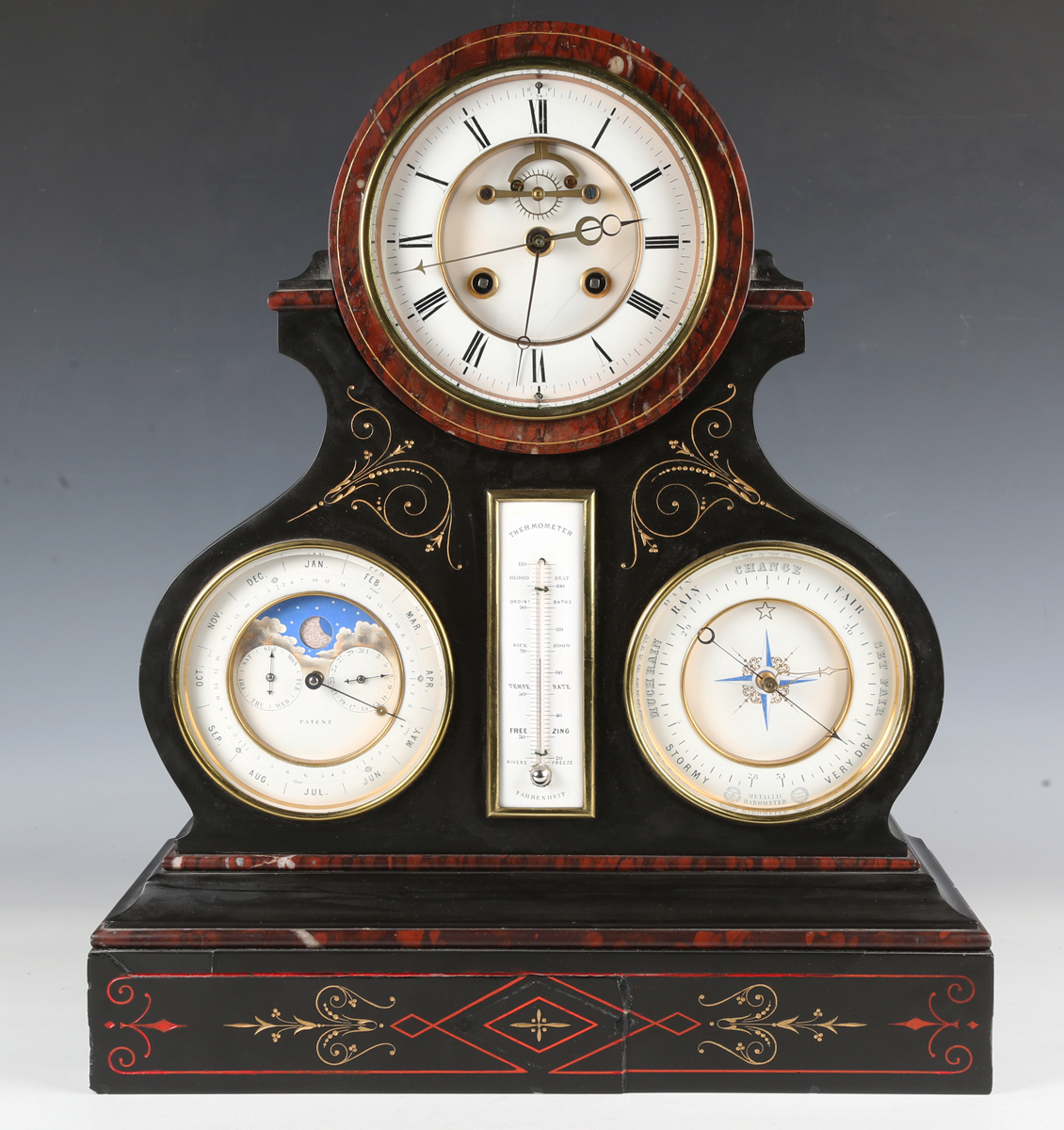 A late 19th century French black slate and rouge marble perpetual calendar table clock with moonphase, mercury thermometer and barometer, the clock with eight day movement striking on a bell, the backplate stamped 'Dent a Paris' and numbered '15410' and '24.8', the two piece white enamelled dial with black Roman numerals and Brocot escapement, above a white enamelled subsidiary calendar with moonphase and barometer dials, flanking a mercury thermometer, the slate case with rouge marble borders and gilt scroll decoration, on a red and gilt decorated plinth base, height 48cm, with pendulum and winding key (minor repair to base).