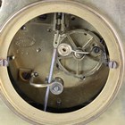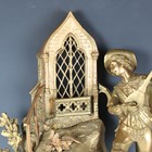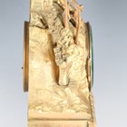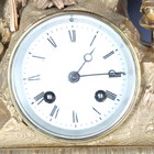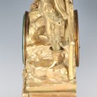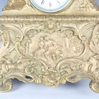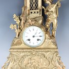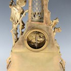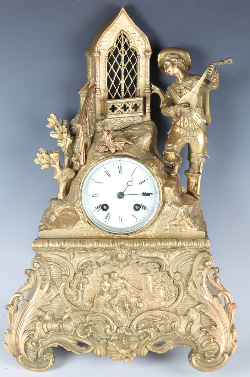 A late 19th century French ormolu mantel clock with eight day bell strike movement, the white enamelled dial with black Roman hour numerals, the naturalistic case modelled with a young man playing a mandolin at a window above cast and foliate scrolls framing a scene of a courting couple to the base, height 42cm, with pendulum (lacking bell and back foot).