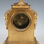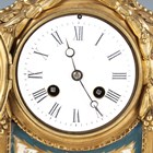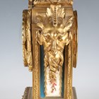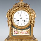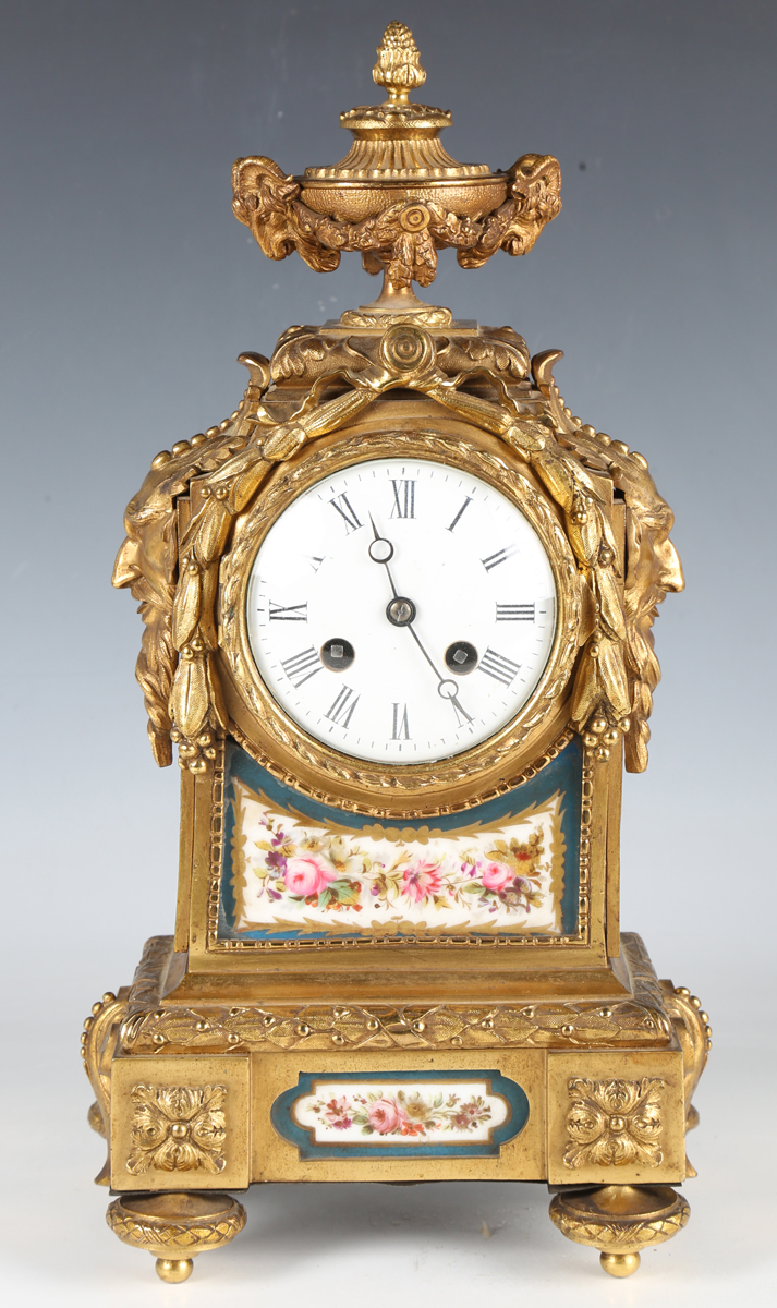 A late 19th century French ormolu and porcelain mantel clock with eight day movement striking on a bell via an outside countwheel, the backplate with Japy Frères maker's stamp, the white enamelled dial with black Roman hour numerals, the case with cast urn surmount above masks and acanthus swags, inset with porcelain panels of painted flowers within gilt and bleu céleste borders, on an inverted breakfront base and toupie feet, height 37.5cm, with pendulum (lacking bell).