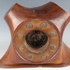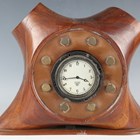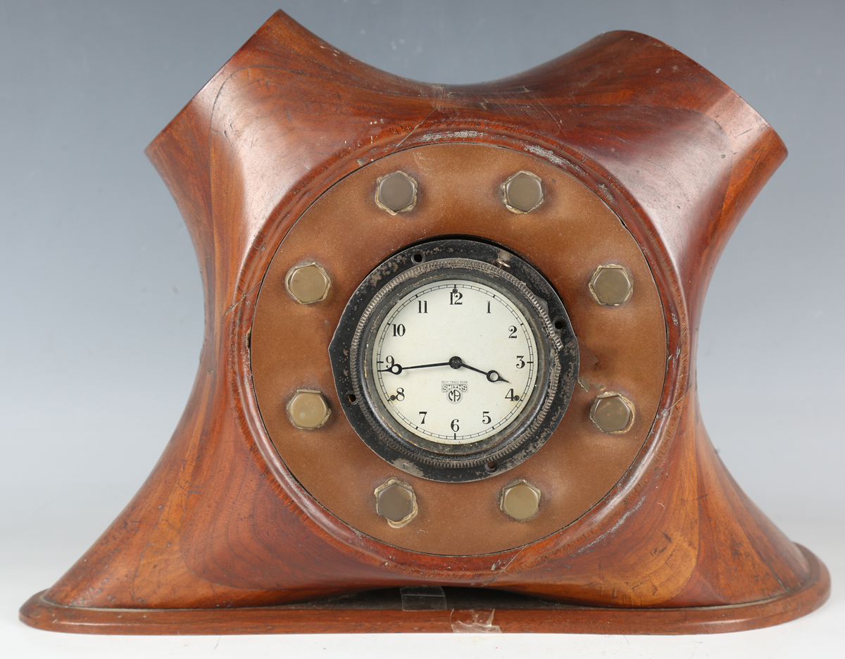 An early 20th century RAF 4A mahogany four-bladed propeller mantel timepiece, each blade cut down and the hub inset with a Smiths timepiece, the case impressed 'RAF 4A D2970 P8040 RE8' to one side and 'G1397N29' above 'DG T299OM LH' to the other, height 28cm, width 38cm.