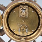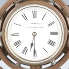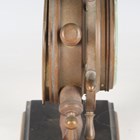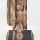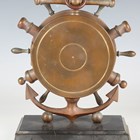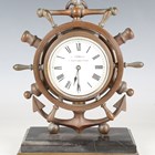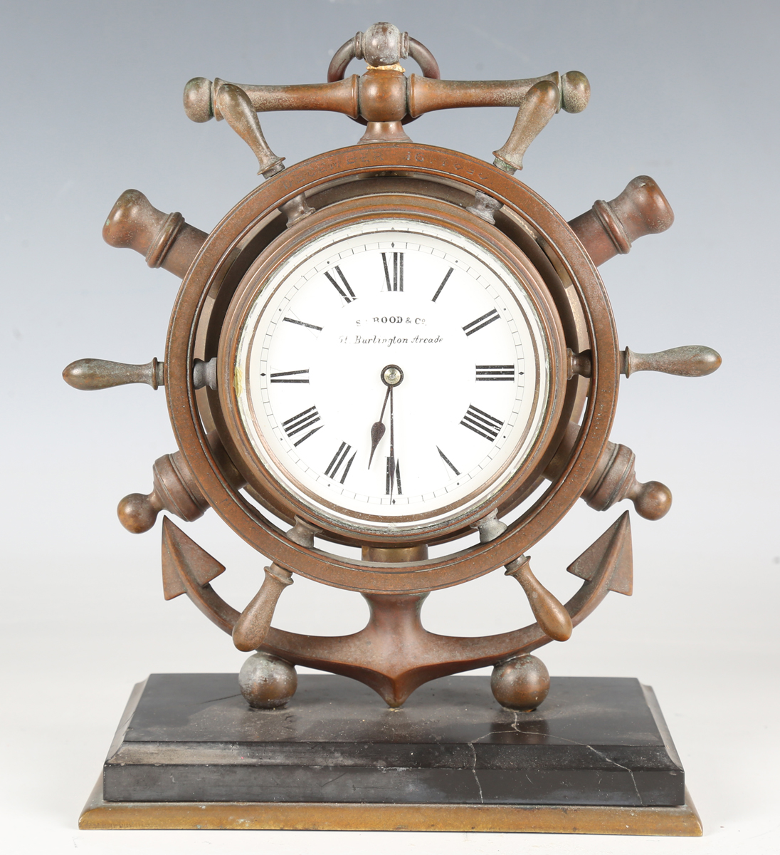 A late Victorian brass and black slate novelty desk timepiece, modelled as a ship's wheel and anchor, the movement with platform escapement, the 3½-inch white enamelled circular dial with black Roman hour numerals and inscribed 'S.J. Rood & Co 51 Burlington Arcade', on a black slate and brass rectangular plinth, height 24cm, with key (slate plinth repaired).