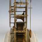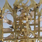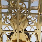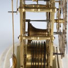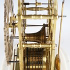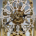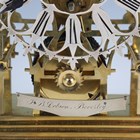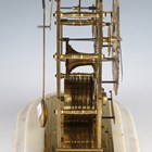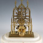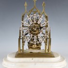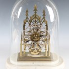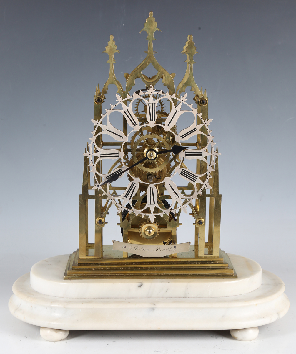 A late Victorian brass skeleton timepiece with eight day single chain fusee movement, the skeletonized silvered chapter ring with black Roman hour numerals, the pierced cathedral-form frame with triple gothic arch surmount above a silvered plaque inscribed 'J.B. Dobson Beverley', on a white marble oval base with bun feet and glass dome, height 42.5cm, with pendulum.