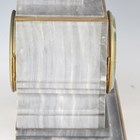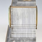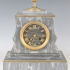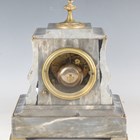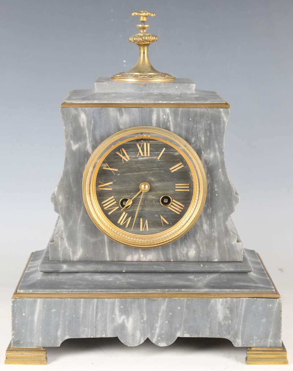 A late 19th century French brass mounted grey marble mantel clock with eight day movement striking on a bell, the dial with gilt Roman hour numerals, the case with rectangular plinth base and brass bracket feet, height 31.7cm, with pendulum.