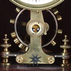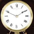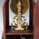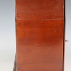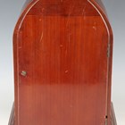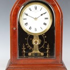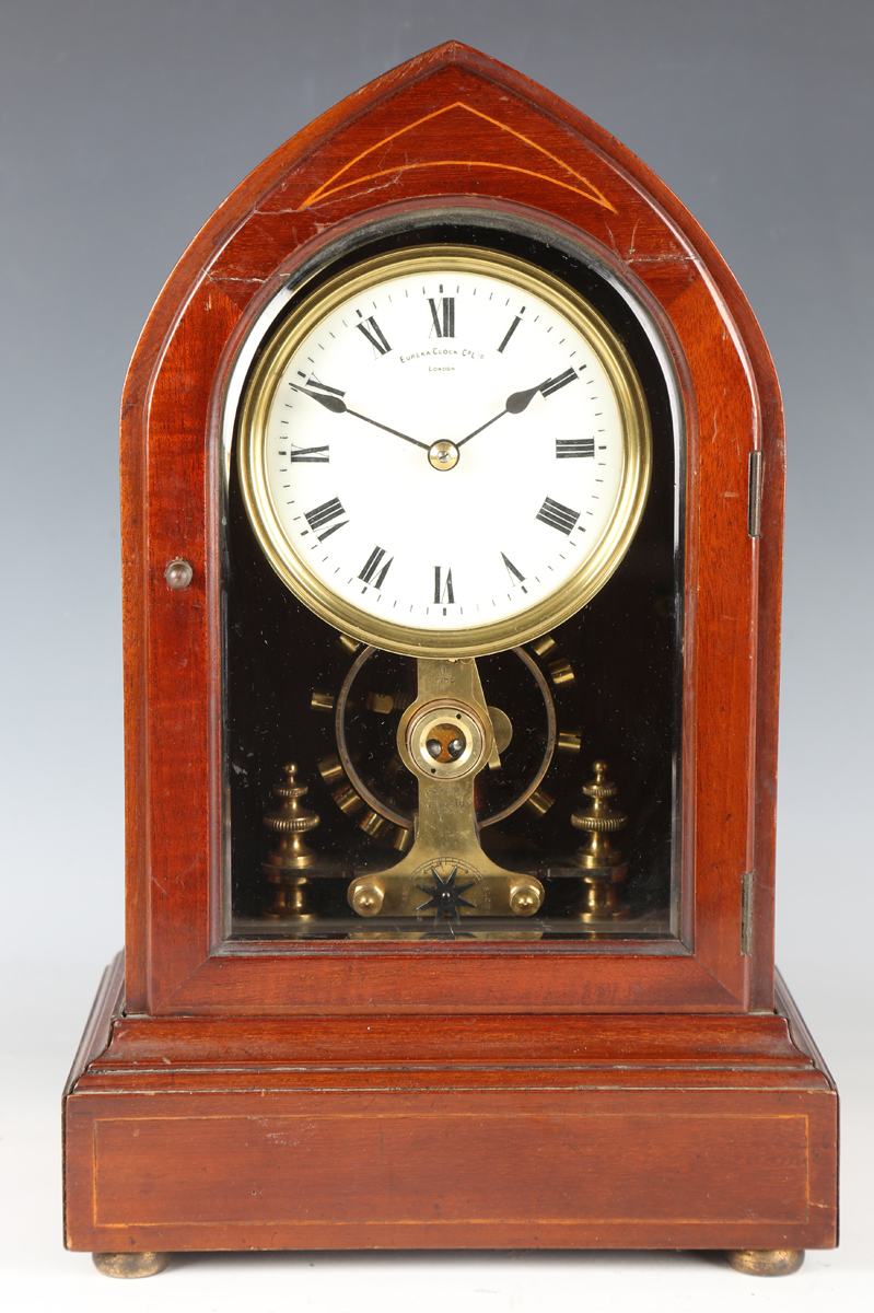 An early 20th century Eureka Clock Co Ltd electromagnetic balance mahogany cased mantel timepiece, the signed cream dial with black Roman hour numerals and inscribed 'Eureka Clock Co Ltd London', the movement detailed 'No. 7179' above 'Patent No. 14614' and '1906', the lancet arched case with boxwood line inlaid decoration and bevelled glass door, above a plinth base and brass bun feet, height 38cm.