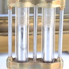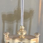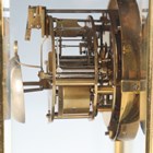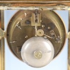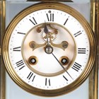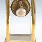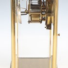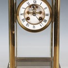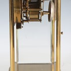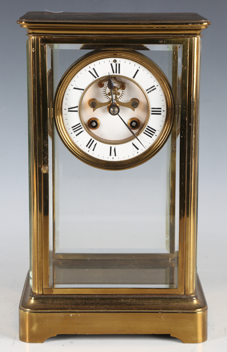 A late 19th/early 20th century French brass cased four glass mantel clock with eight day movement striking on a bell, the backplate with Japy Frères stamped maker's mark, with mercury compensated pendulum, the two piece enamelled dial with visible Brocot escapement and black Roman hour numerals, the case with moulded top and base, bevelled glass panels and doors, on bracket feet, height 29.7cm.