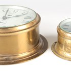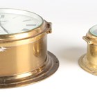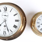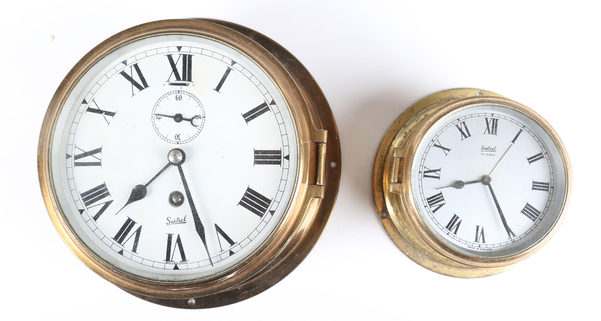 A 20th century lacquered brass circular ship's style wall timepiece, the white enamelled dial with black Roman hour numerals, subsidiary seconds and slow/fast indicator and inscribed 'Sestrel', case diameter 20.3cm, together with a 20th century small lacquered brass cased Sestrel Alarm ship's style wall clock, case diameter 13.2cm.