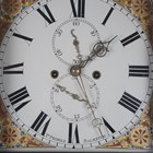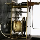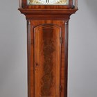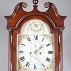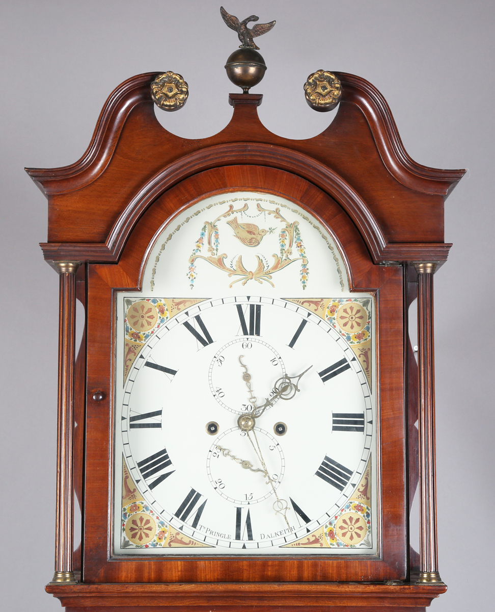 A William IV Scottish inlaid mahogany longcase clock with eight day movement striking on a bell, the 13-inch painted breakarch dial with gilt decoration, black Roman hour numerals, subsidiary date and seconds dials, inscribed 'Ts Pringle Dalkeith', the hood with swan neck pediment, glazed door and fluted columns, the arched trunk door flanked by reeded corner columns, on bracket feet, height 216cm, with pendulum, two weights and winder. Note: Thomas Pringle is a recorded Scottish clockmaker working in Dalkeith circa 1830-36.
