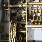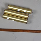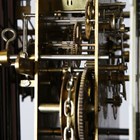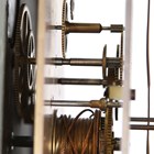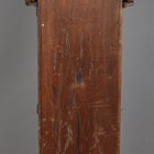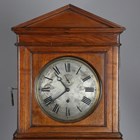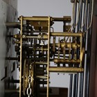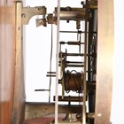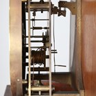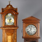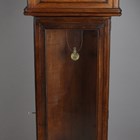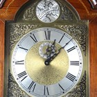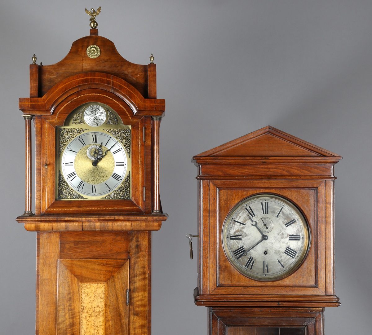 A 20th century German walnut longcase clock with three train chiming movement, the 10-inch brass breakarch dial with silvered 'Tempus Fugit' boss to arch, the hood with glazed door and turned pillars above a rectangular trunk door with glazed lenticle, height 221cm, with pendulum and three weights, together with another longcase clock, height 183cm, with pendulum and weight.