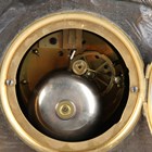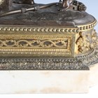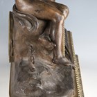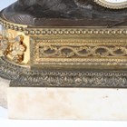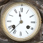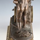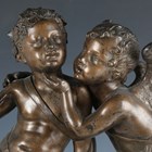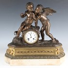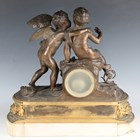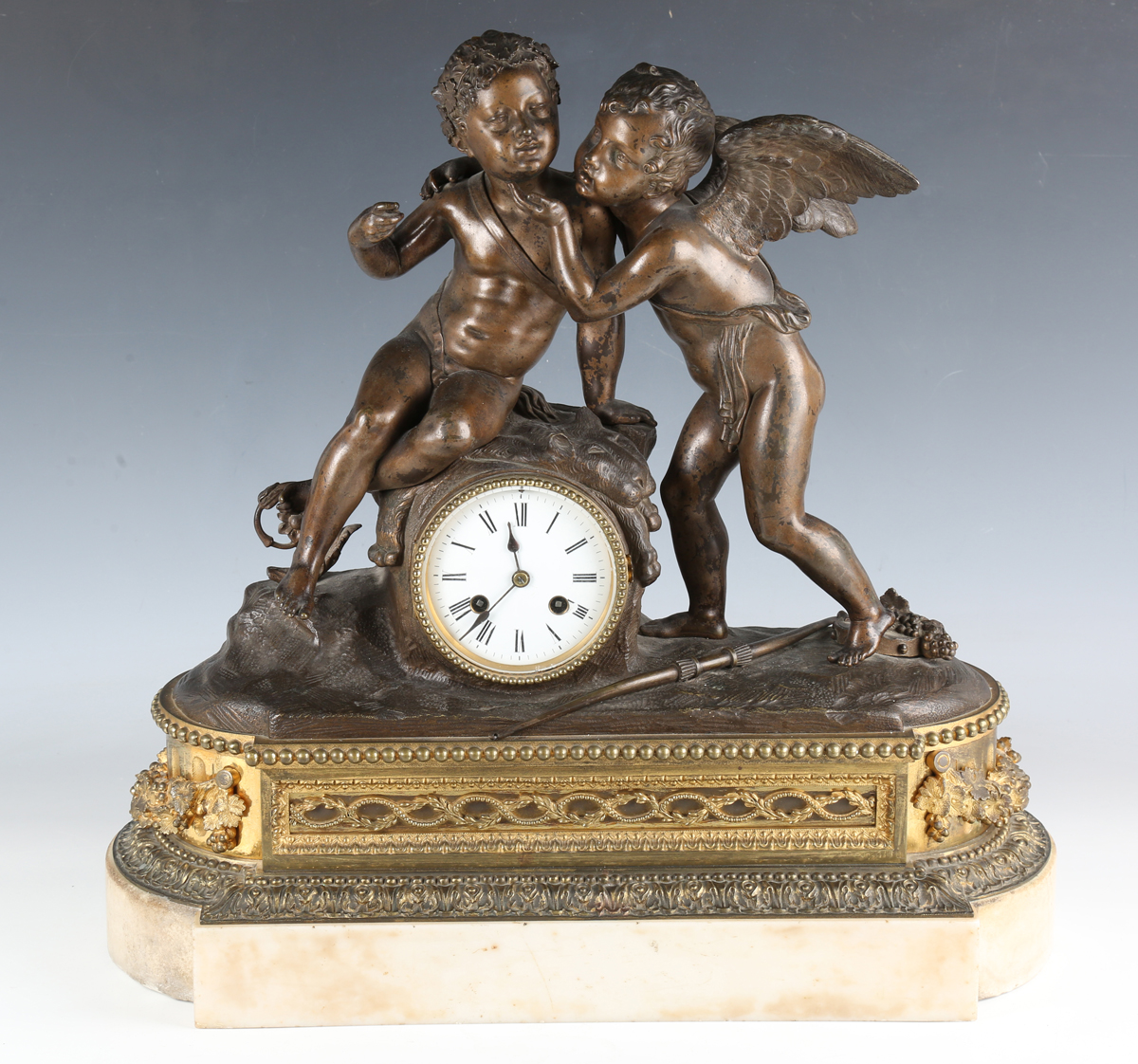 A late 19th century French brown patinated bronze, ormolu and white marble mantel clock with eight day movement striking on a bell via an outside countwheel, the white enamelled dial with black Roman hour numerals, the case surmounted with Cupid and putto, on a breakfront base, height 46cm, with pendulum and winding key.