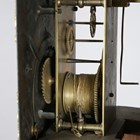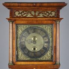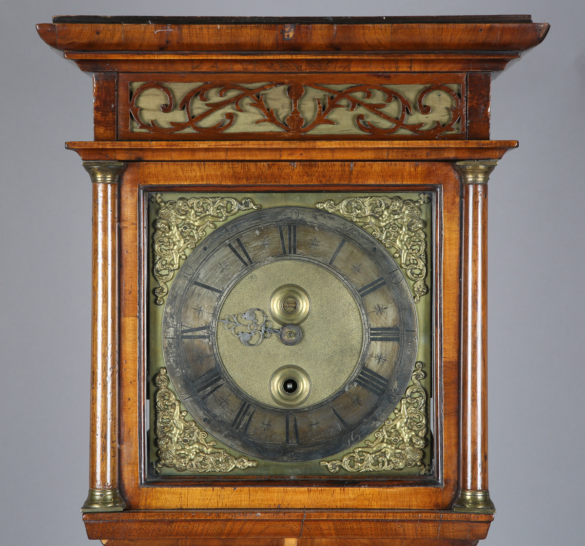 An early 18th century longcase clock movement and dial with thirty hour movement, within a later walnut case, the 10-inch square dial with single hand and silvered chapter ring inscribed 'James Webb Bristol', the later walnut case with quarter veneered rectangular trunk door, on bracket feet, height 183.5cm, with pendulum, brass cased weight and winder (alterations and restoration).