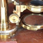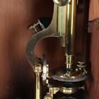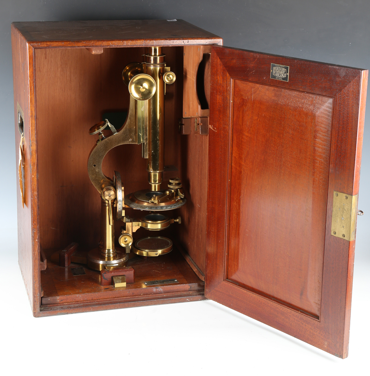An early 20th century gilt lacquered brass binocular microscope, signed 'Watson & Sons, 313 High Holborn, London' and numbered '1812', with rack and pinion focusing, fine focusing, circular stage and plano-concave mirror, on a triform base, height 46cm, within a Broadhurst Clarkson & Co mahogany case.