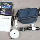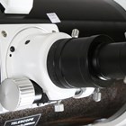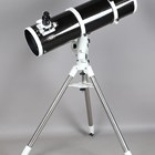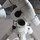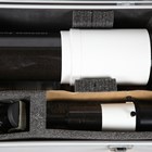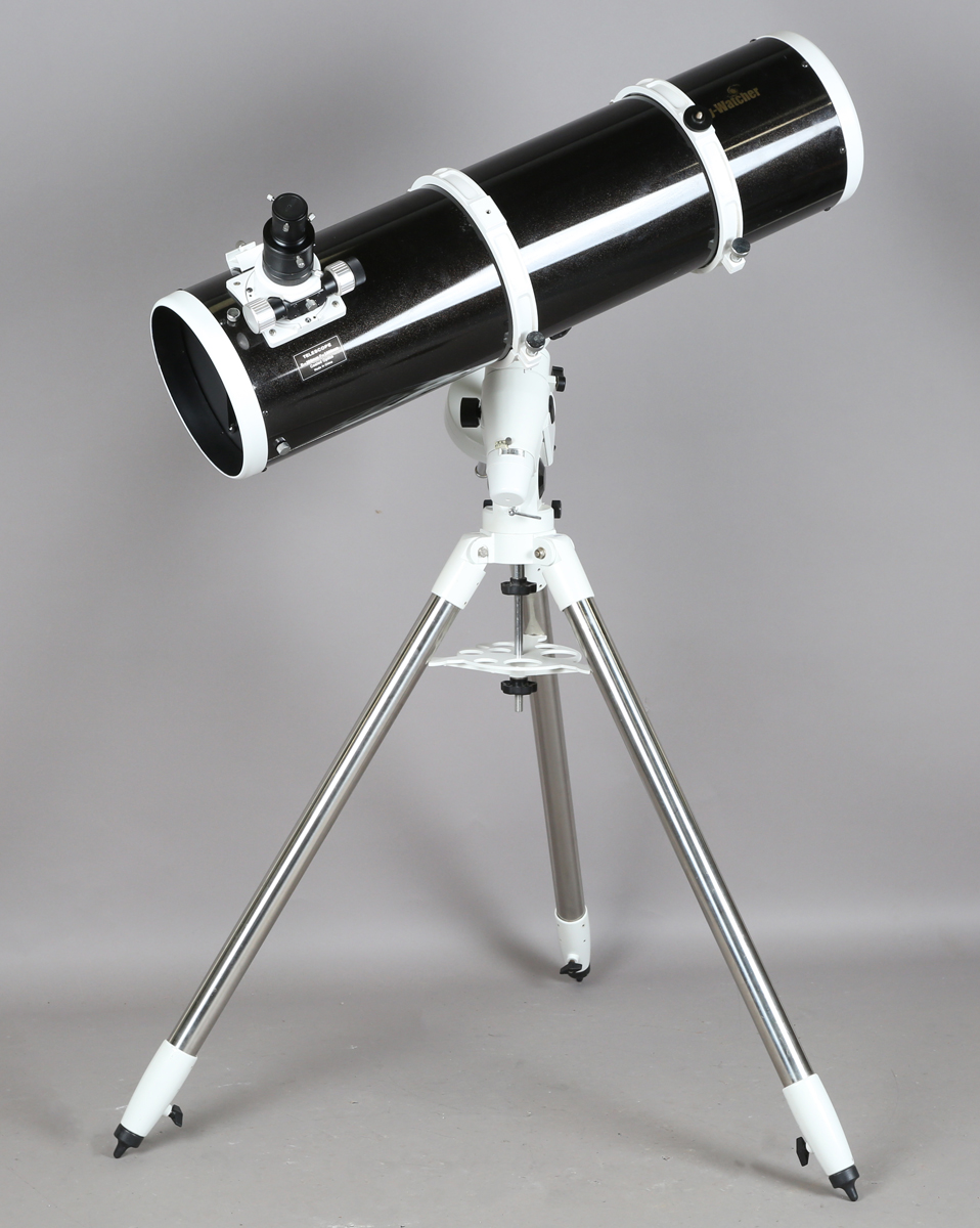 A Sky-Watcher 8-inch aperture Newtonian reflector telescope, with tripod stand, a Sky-Watcher ED100 4-inch aperture refractor telescope, with spotter scope, a red-dot spotter, a camera adapter for SLR cameras and other accessories, including filters, lenses, two aluminium cases, instructions and various booklets.