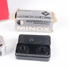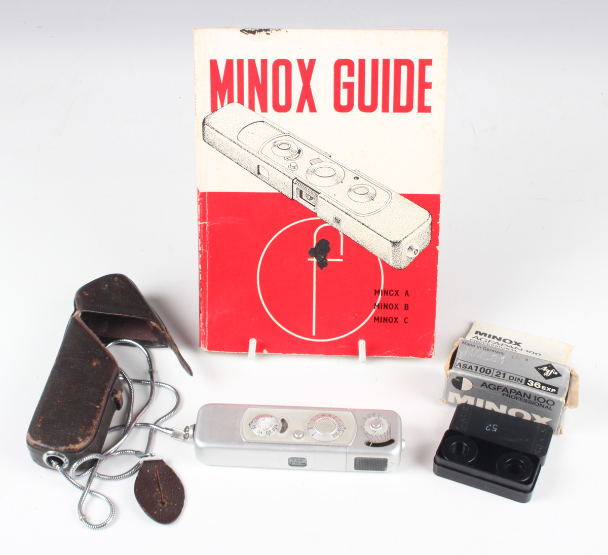 A Minox B miniature camera with Complan 1:3.5 f=15mm lens, with leather case and Minox guide.