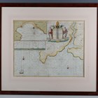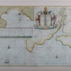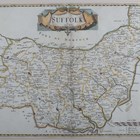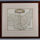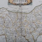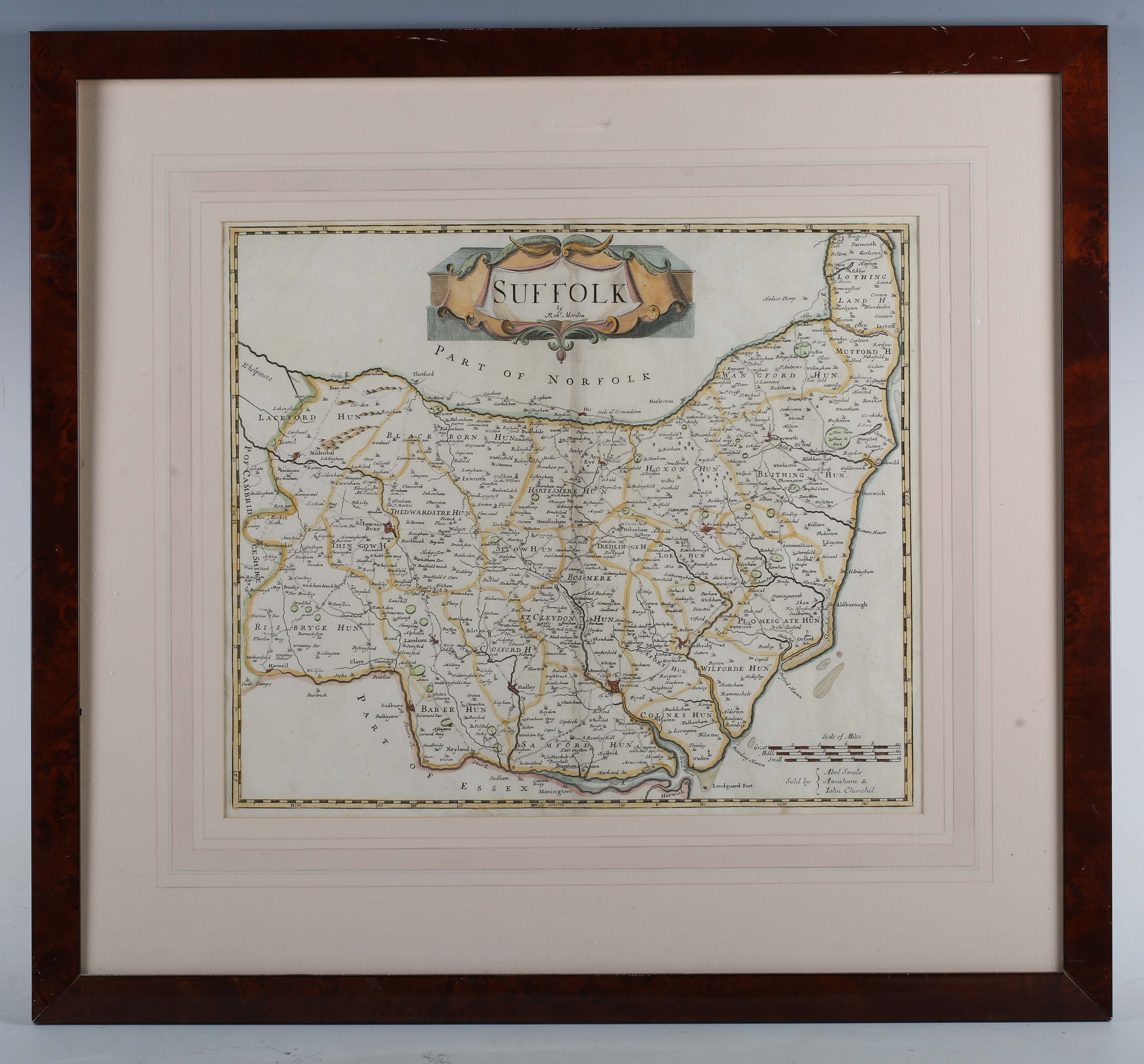 Robert Morden - Map of Suffolk, engraving with hand-colouring, 36cm x 42cm, together with a facsimile print after Capt. Greenville Collins - 'Fowey & Mounts Bay', sea chart with inset map of Mount's Bay and title cartouche, 45cm x 56cm, both within walnut veneered frames (2).