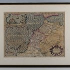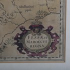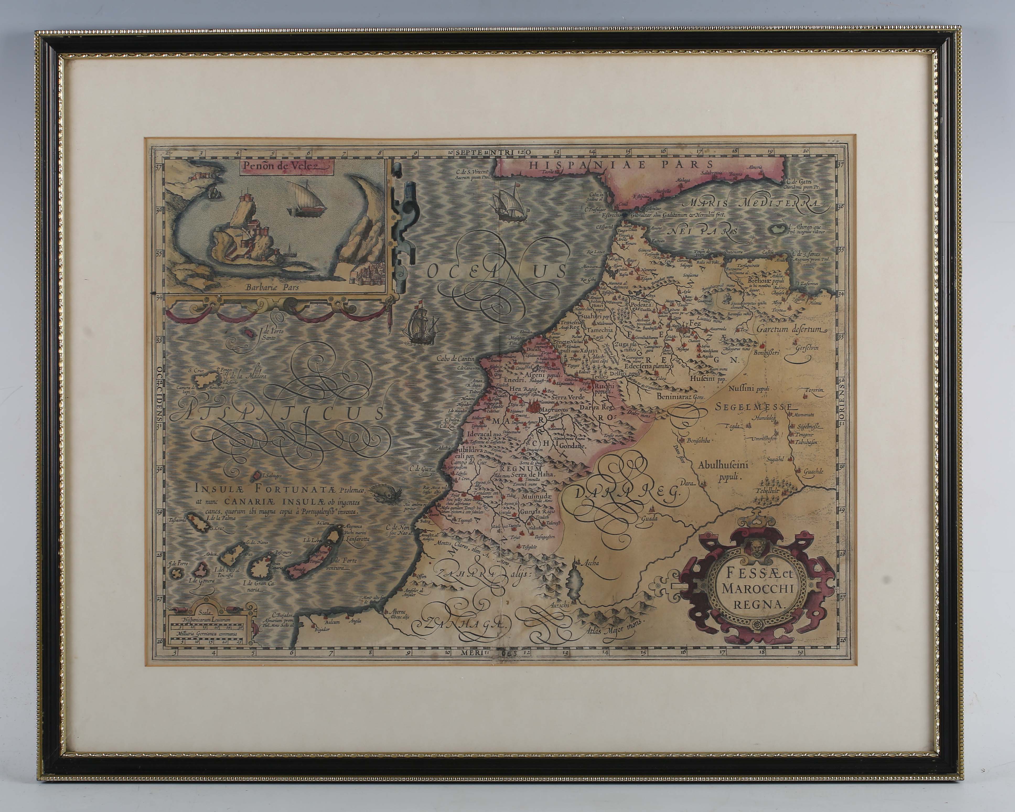 Jodocus Hondius - ‘Fessae et Marocchi Regna’: map of Fez and Marrakesh, Morocco, engraving with hand-colouring, 36cm x 48.5cm, within a Hogarth style frame.