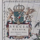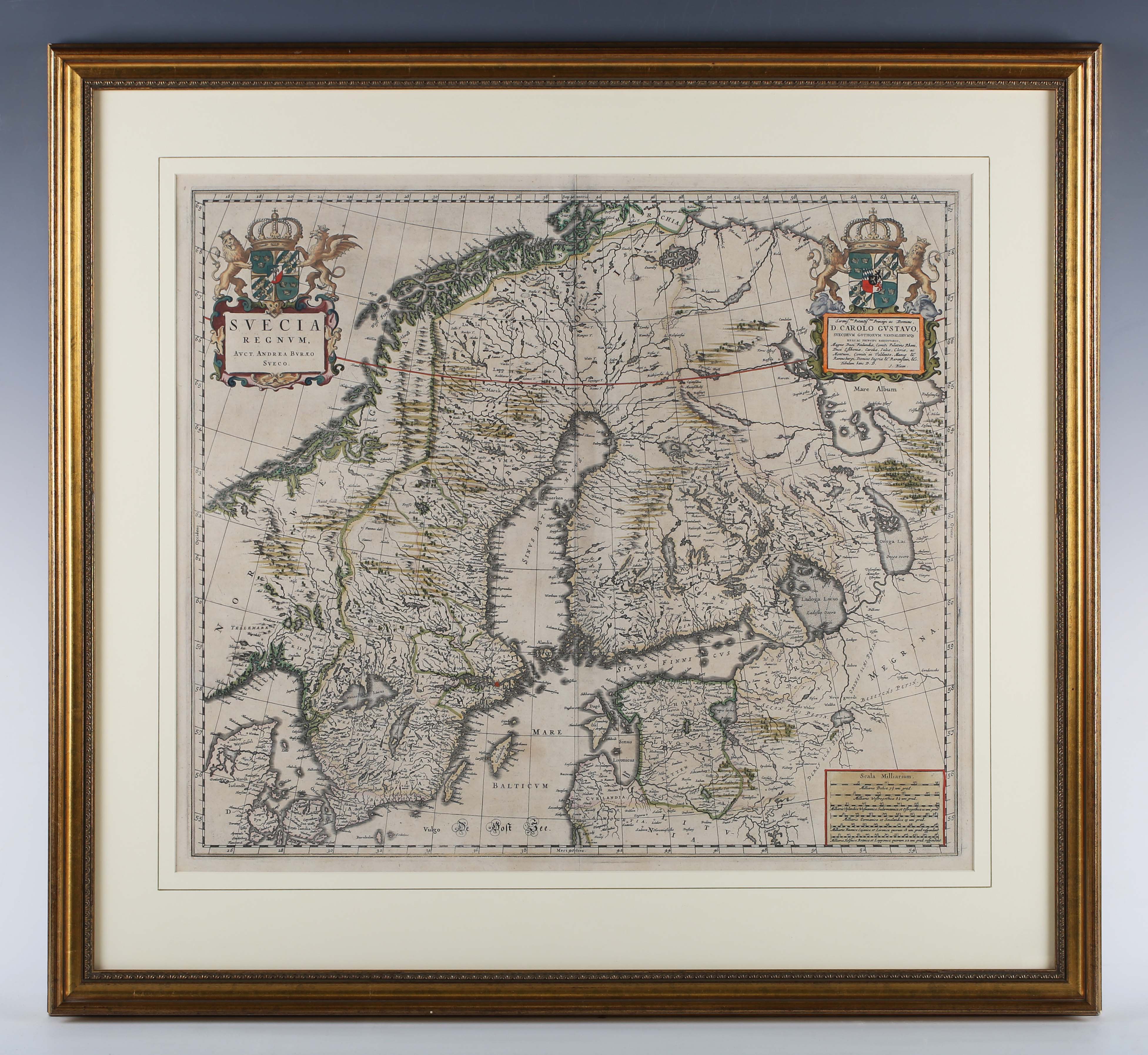 Joan Blaeu - ‘Svecia Regnum’: map of Sweden, engraving, c.1650, with later hand-colouring, text verso, 44cm x 50.5cm, within a gilt frame.
