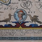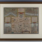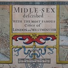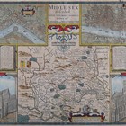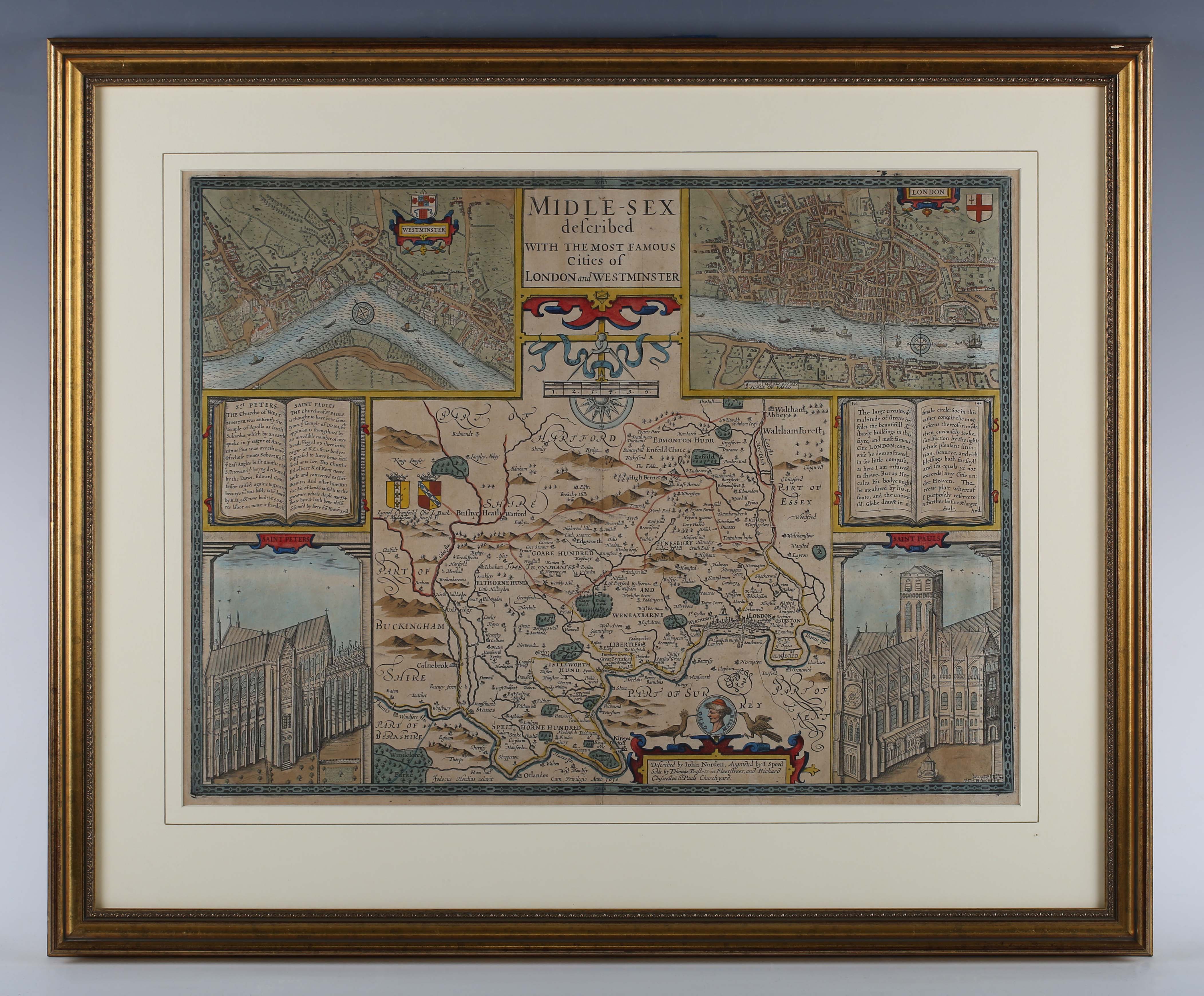 John Speed - 'Midle-Sex described with the most Famous Cities of London and Westminster': Map of Middlesex, described by John Norden, sold by Thomas Bassett, engraving with later hand-colouring, 39cm x 515cm, within a gilt frame.