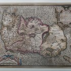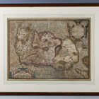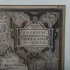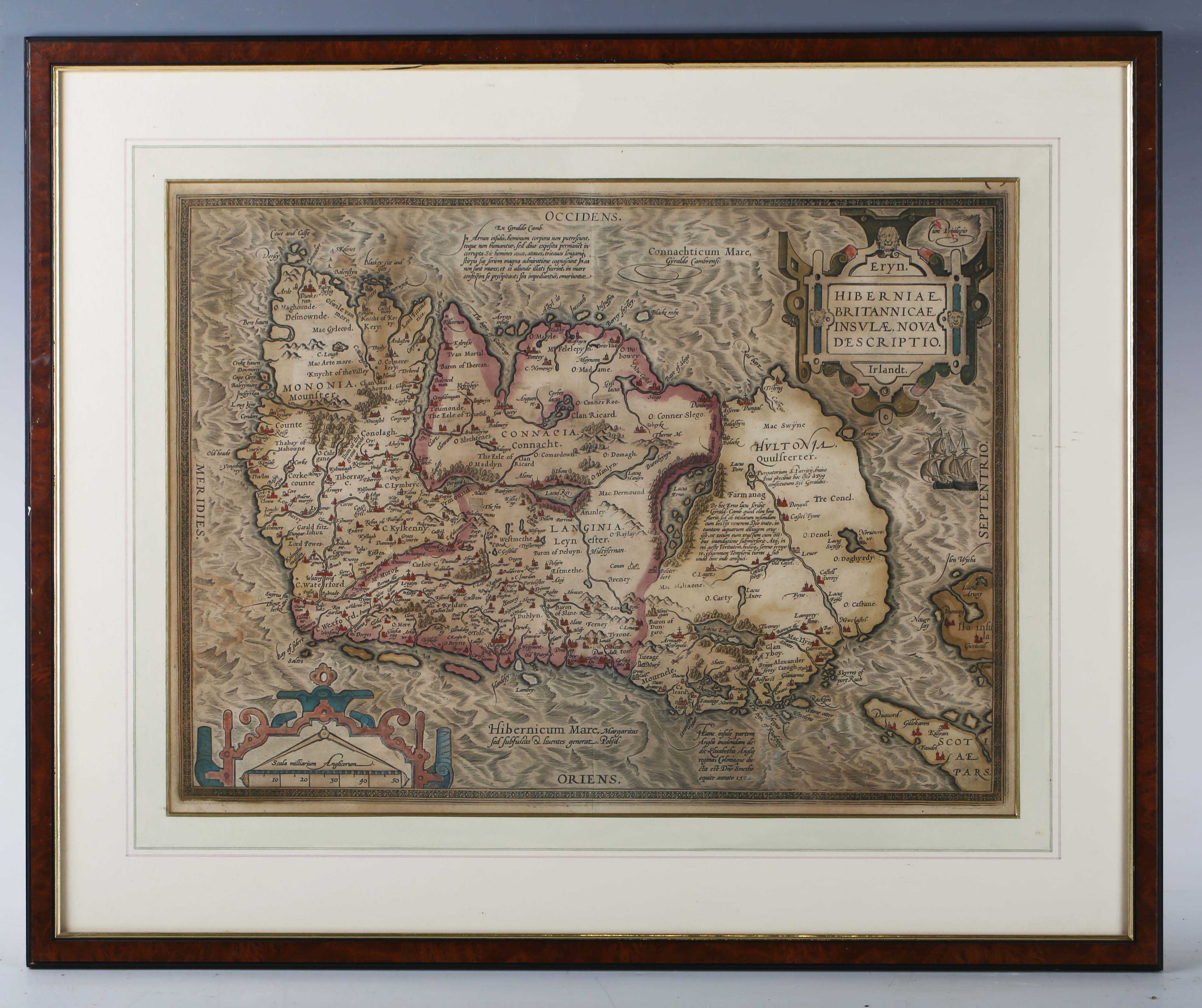 Abraham Ortelius - 'Hiberniae Britannicae Insulae Nova Descriptio. Irlandt': Map of Ireland, engraving with hand-colouring, text verso, 37cm x 49cm, within a walnut veneered frame.
