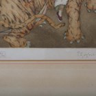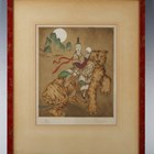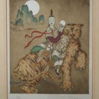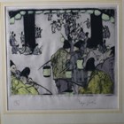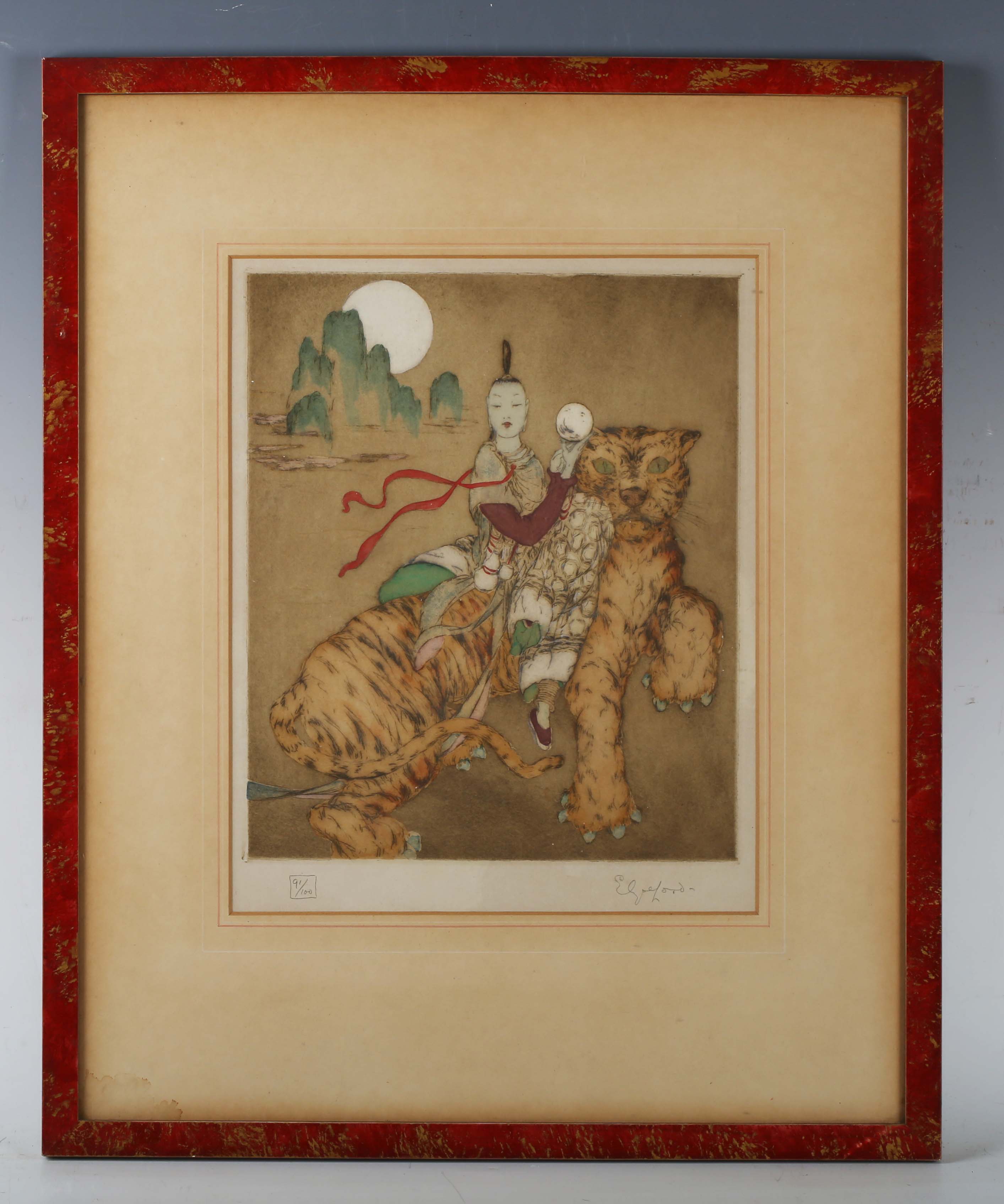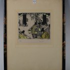 Elyse Ashe Lord (British 1900-1971) - ‘Malo Shan’; Figures with lanterns, two, etchings with colour aquatint, both signed lower right, both numbered lower left, one 91/100, the other 28/75, the larger 33.5cm x 26.5cm, within Chinese style lacquer frames (2).