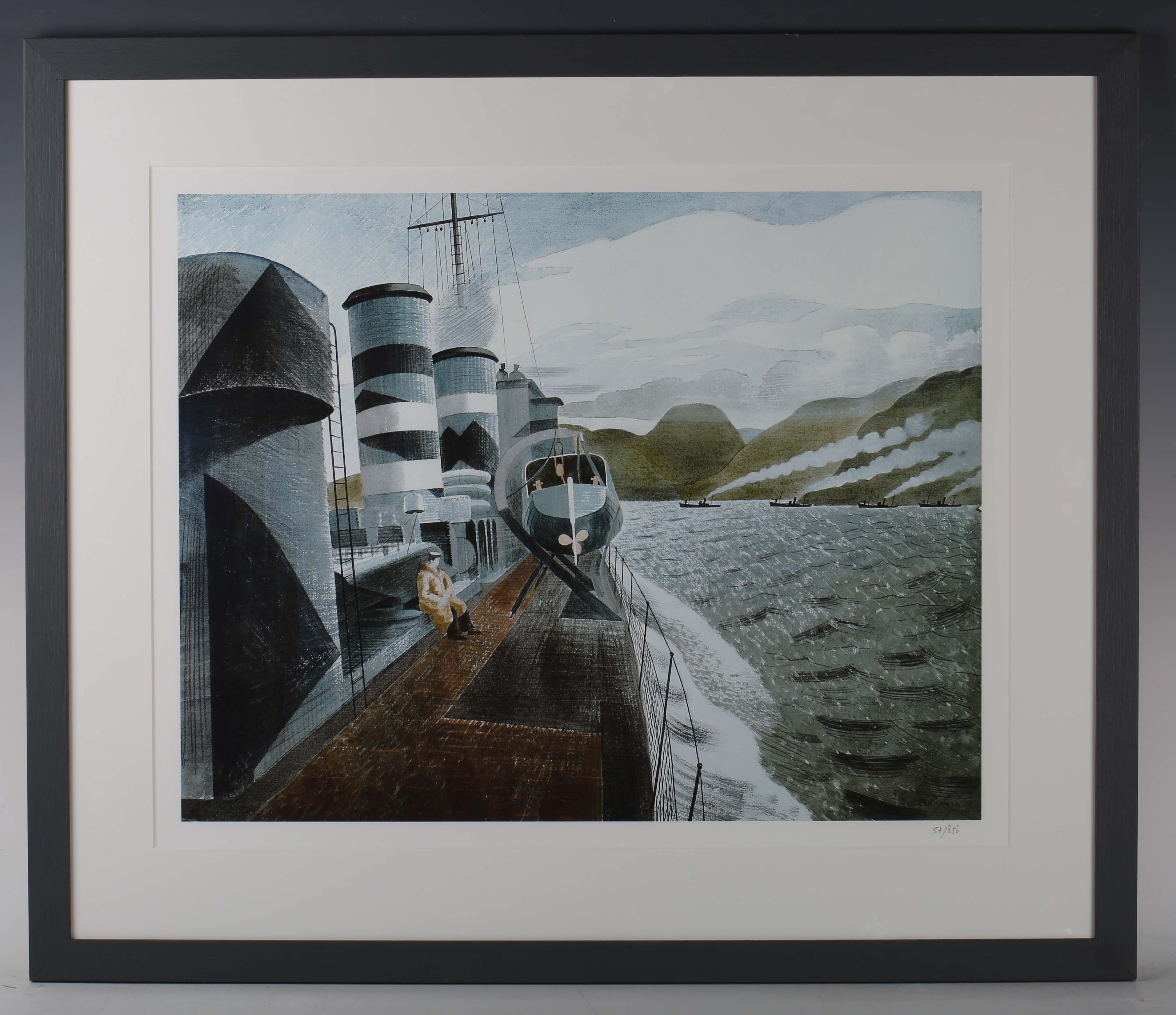 After Eric Ravilious (British 1903-1942) - ‘Leaving Scapa Flow’, modern colour print, numbered 57/850 lower right, 44cm x 57cm, within a grey frame.