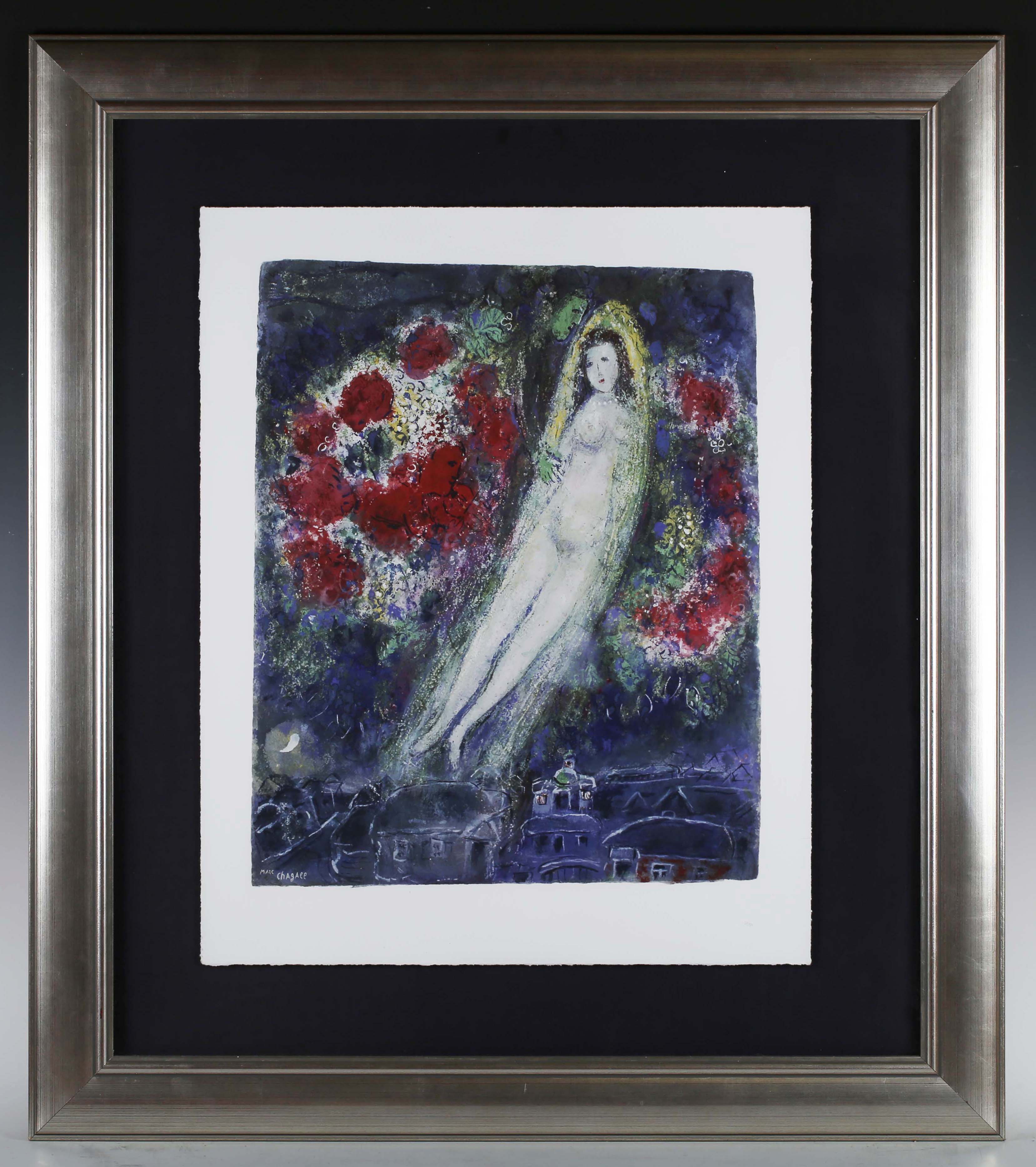 After Marc Chagall (French/Russian 1887-1985) - 'The Bride with Flowers', limited edition gouttelette, numbered 22/50 to lower right margin, p.59cm x 47cm, within a silvered frame, with Charles Phillips and Chelsea Green Editions certificates of authenticity.