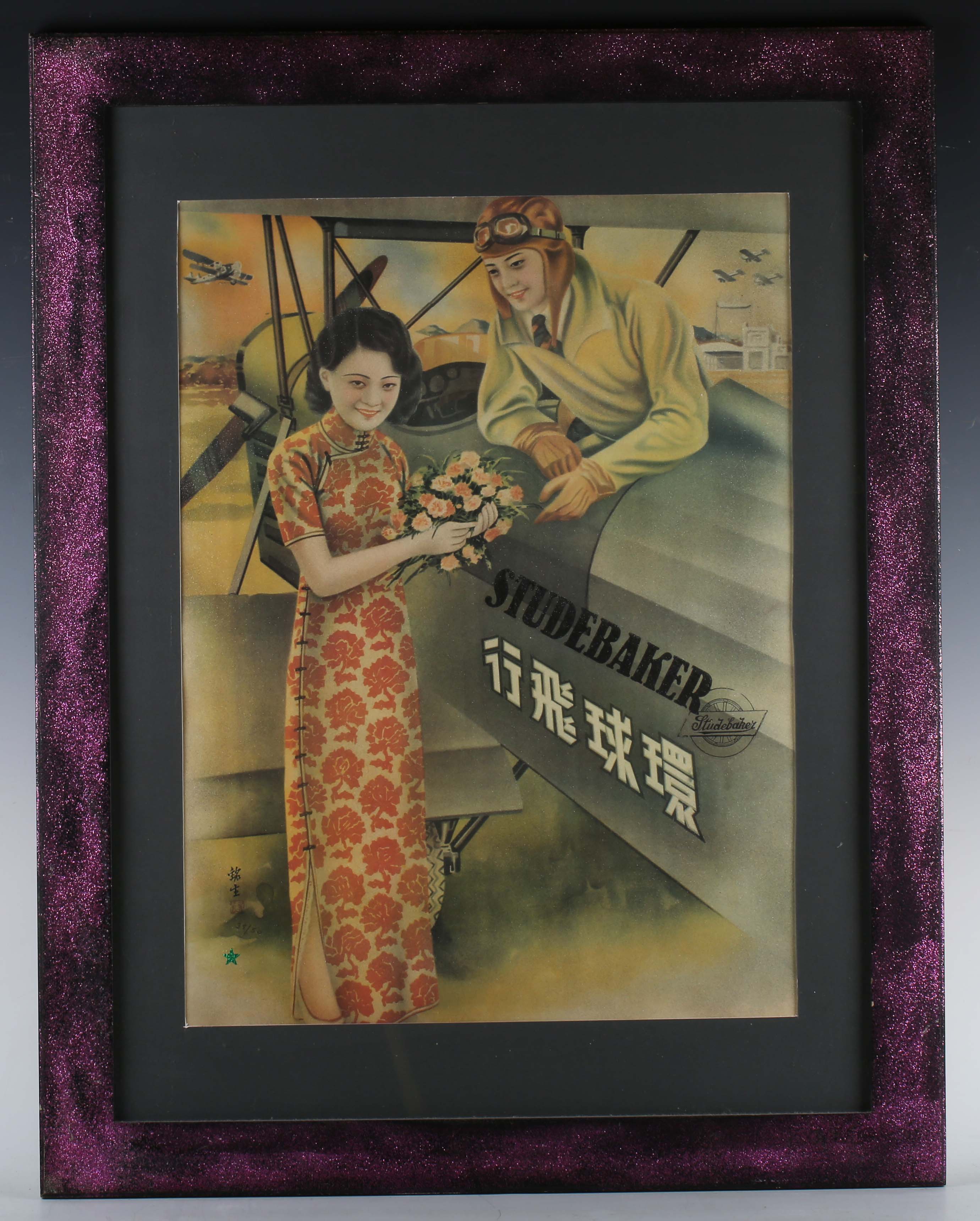 'Pietro Psaier' (purportedly Italian 1936-2004) - 'The Shanghai Studebaker Aero Race', silkscreen with gemdust, numbered 38/50, with certificate of authenticity verso, 64cm x 47.5cm, within a pink glitter frame.