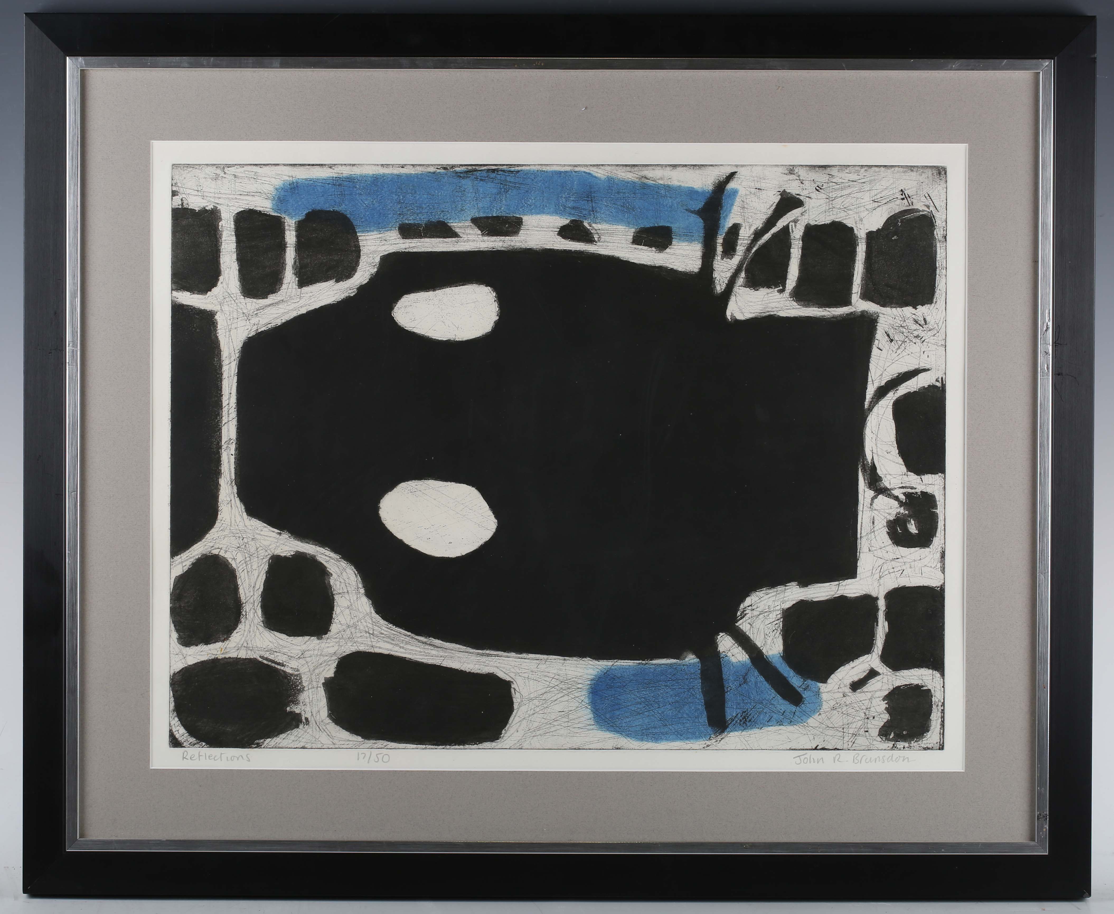 John Brunsdon (British, 1933-2014) - ‘Reflections’, colour etching with aquatint, signed lower right, numbered 17/50 and titled lower left, p.45cm x 59.5cm, within a black frame.