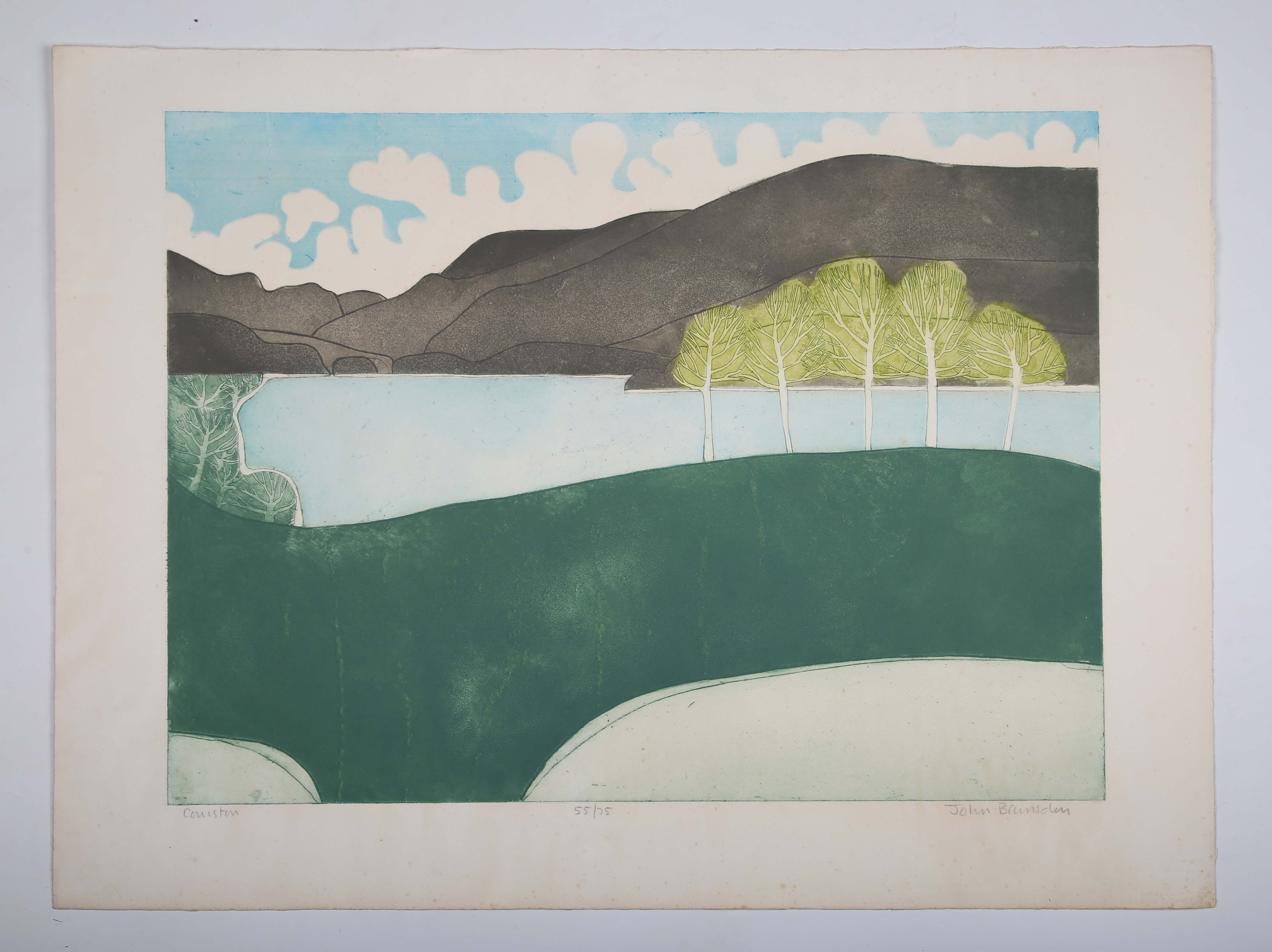 John Brunsdon (British, 1933-2014) - ‘Coniston’, colour etching with aquatint, signed lower right, numbered 55/75 lower centre and titled lower left, p.46cm x 60cm, together with three further by the same hand: ‘Sharpenhoe Clappers’, ‘Dusk’ and ‘Across the City’, all signed, titled and variously numbered, all unframed (4).