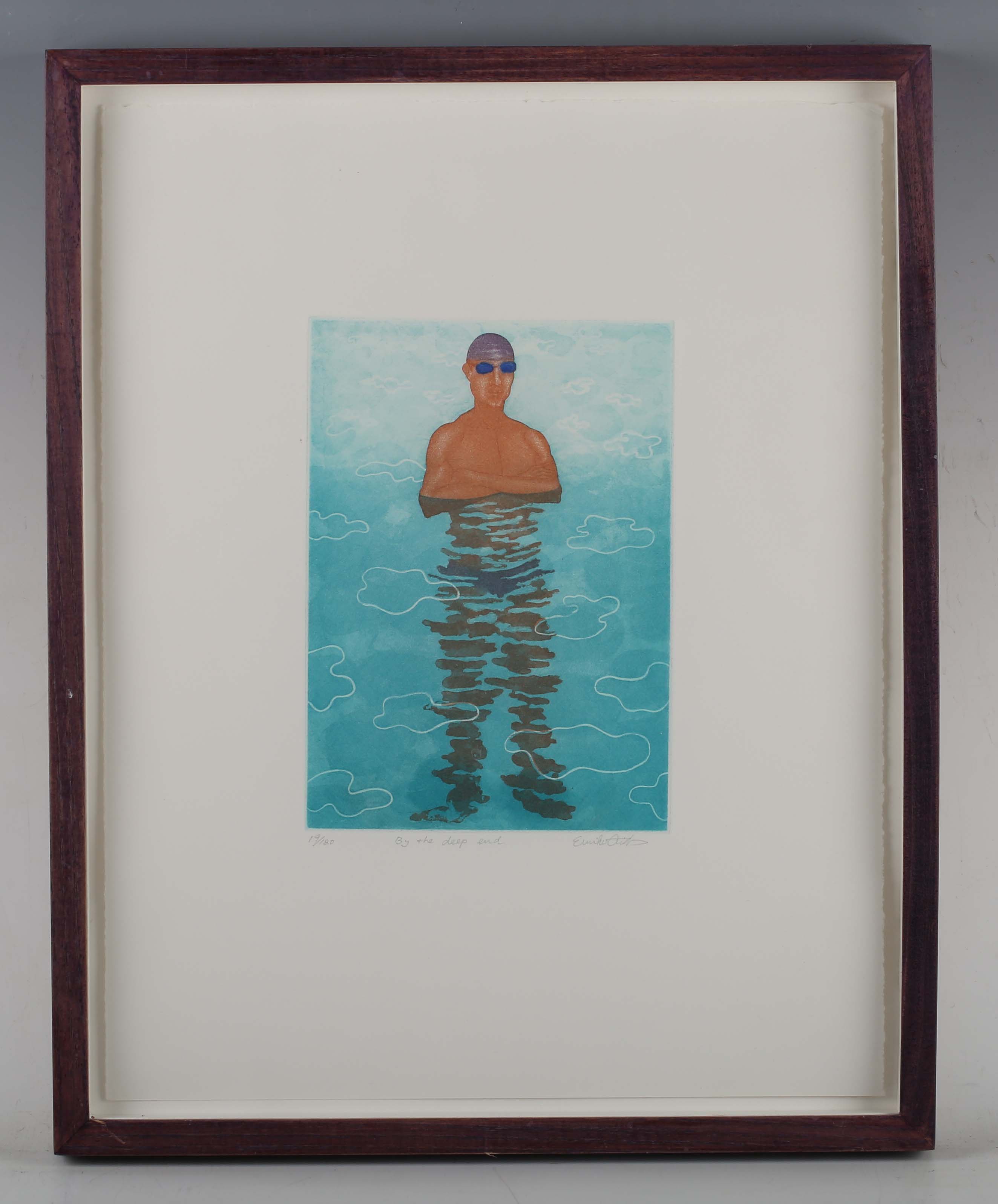 Emile A****? (20th/21st century) - ‘By the deep end’; ‘Up-side down’; ‘A float’, three, colour etchings with aquatint, all indistinctly signed lower right, titled and variously numbered from editions of 180 and 120, the largest p.21cm x 15cm, all within stained wood frames (3).