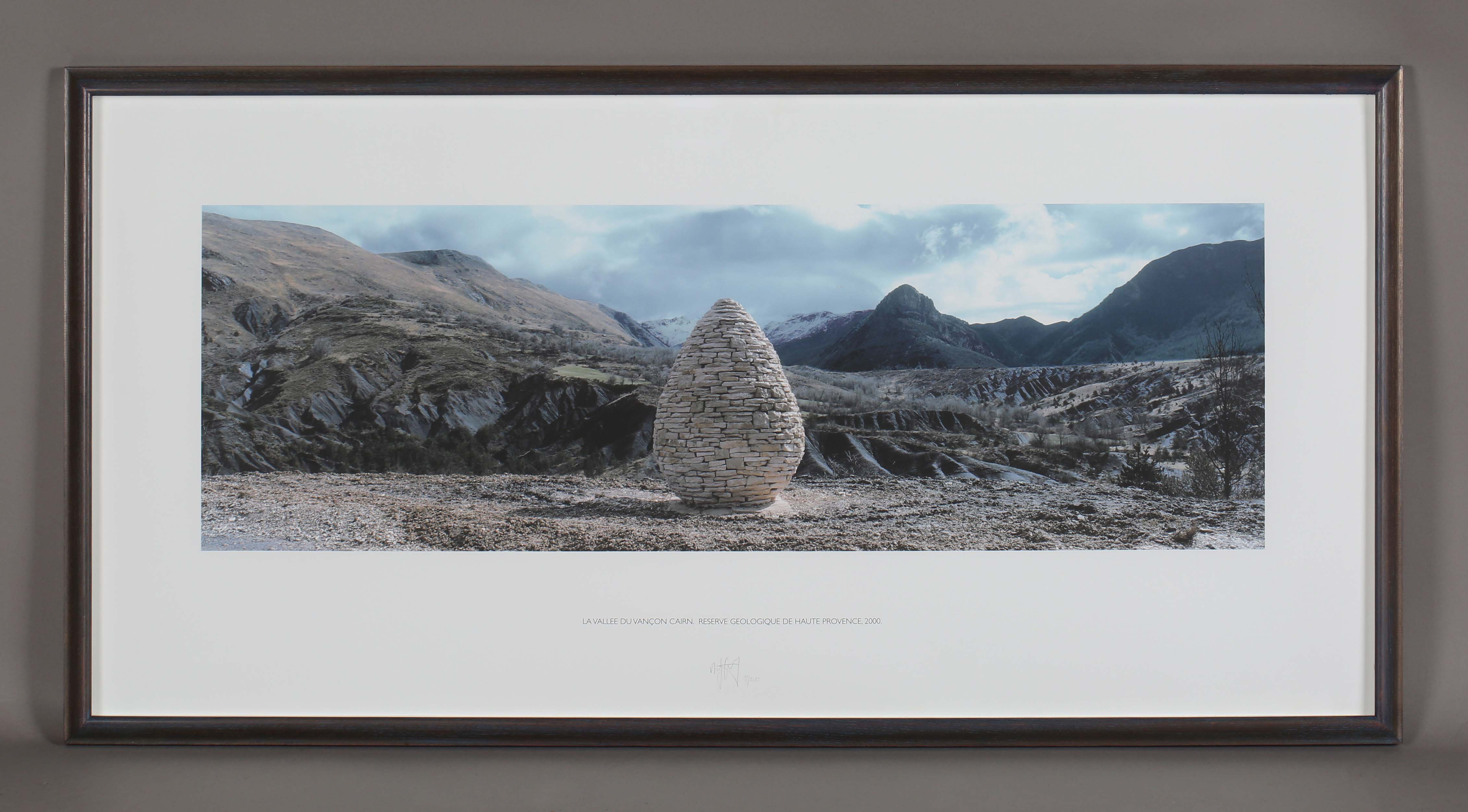 Andy Goldsworthy (British b.1956) - 'La Vallée du Vançon Cairn, Reserve Géologique de Haute Provence, 2000', colour print, signed 7/500 lower centre, p.30cm x 94cm, within a stained wood frame.