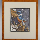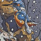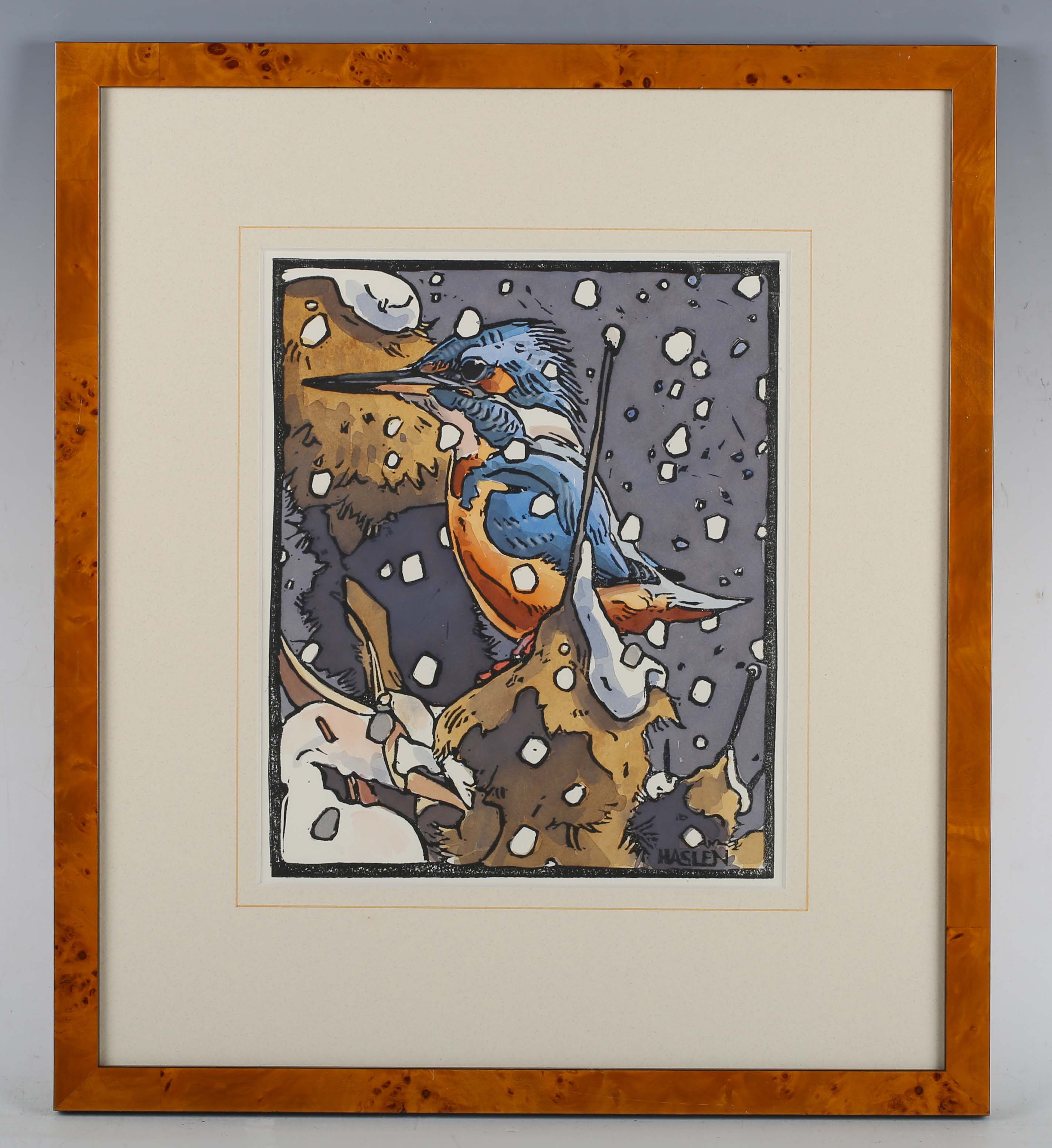 Andrew Haslen (British b.1953) - Kingfisher, colour linocut, 27.5cm x 22.5cm, within a walnut veneered frame.
