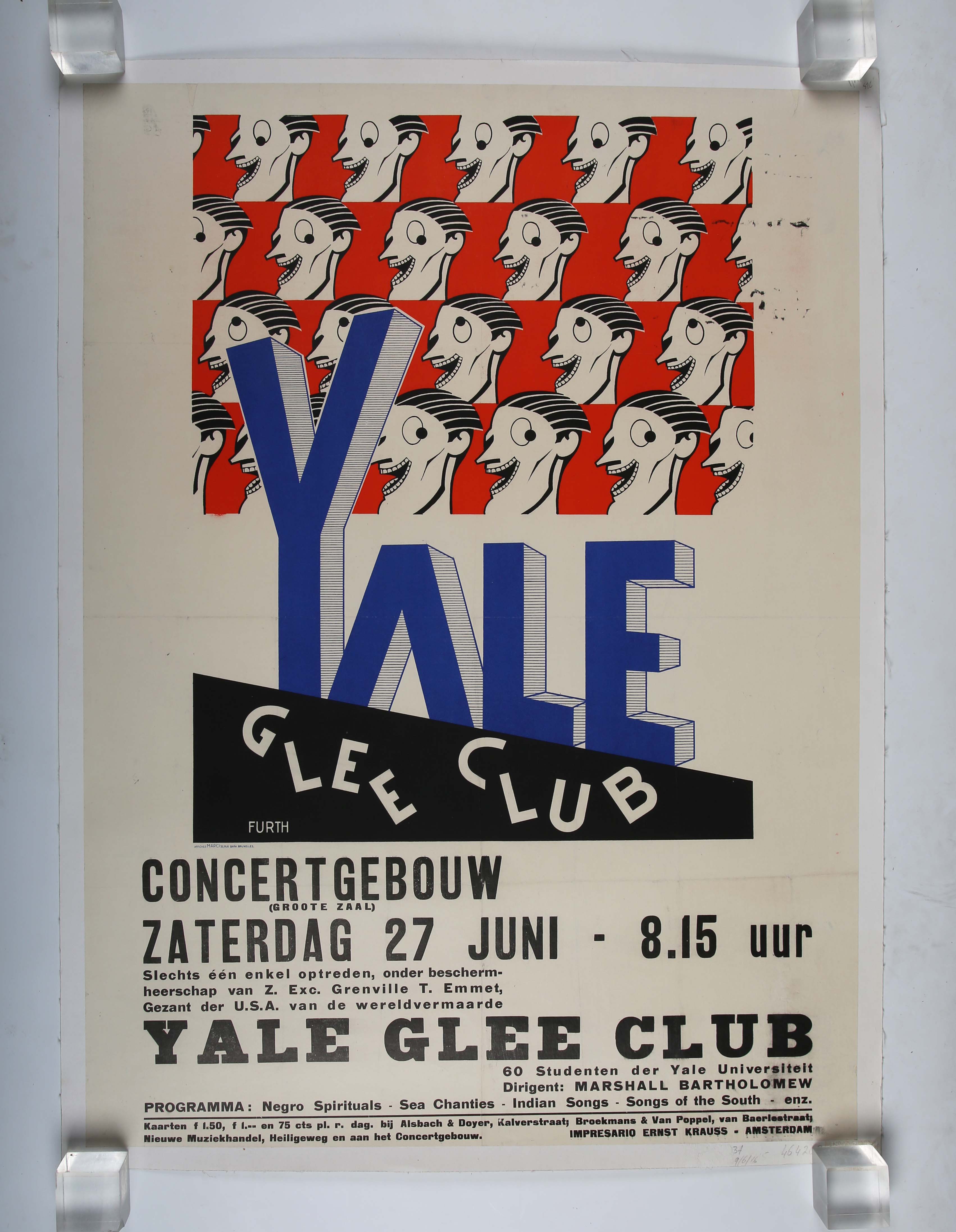 Furth - 'Yale Glee Club. Concertgebouw', poster, [Director: Marshall Bartholemew] Amsterdam: Impresario Ernst Krauss, 1953? 85cm x 62cm, unframed Note: under the direction of Marshall Bartholemew, the Yale Glee Club raised performance standards, took on more ambitious repertoire, and toured widely. By the time of his retirement, the Yale Glee Club was internationally renowned. This would have been one of the last tours under his direction, prior to his retirement in 1953.