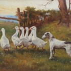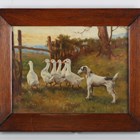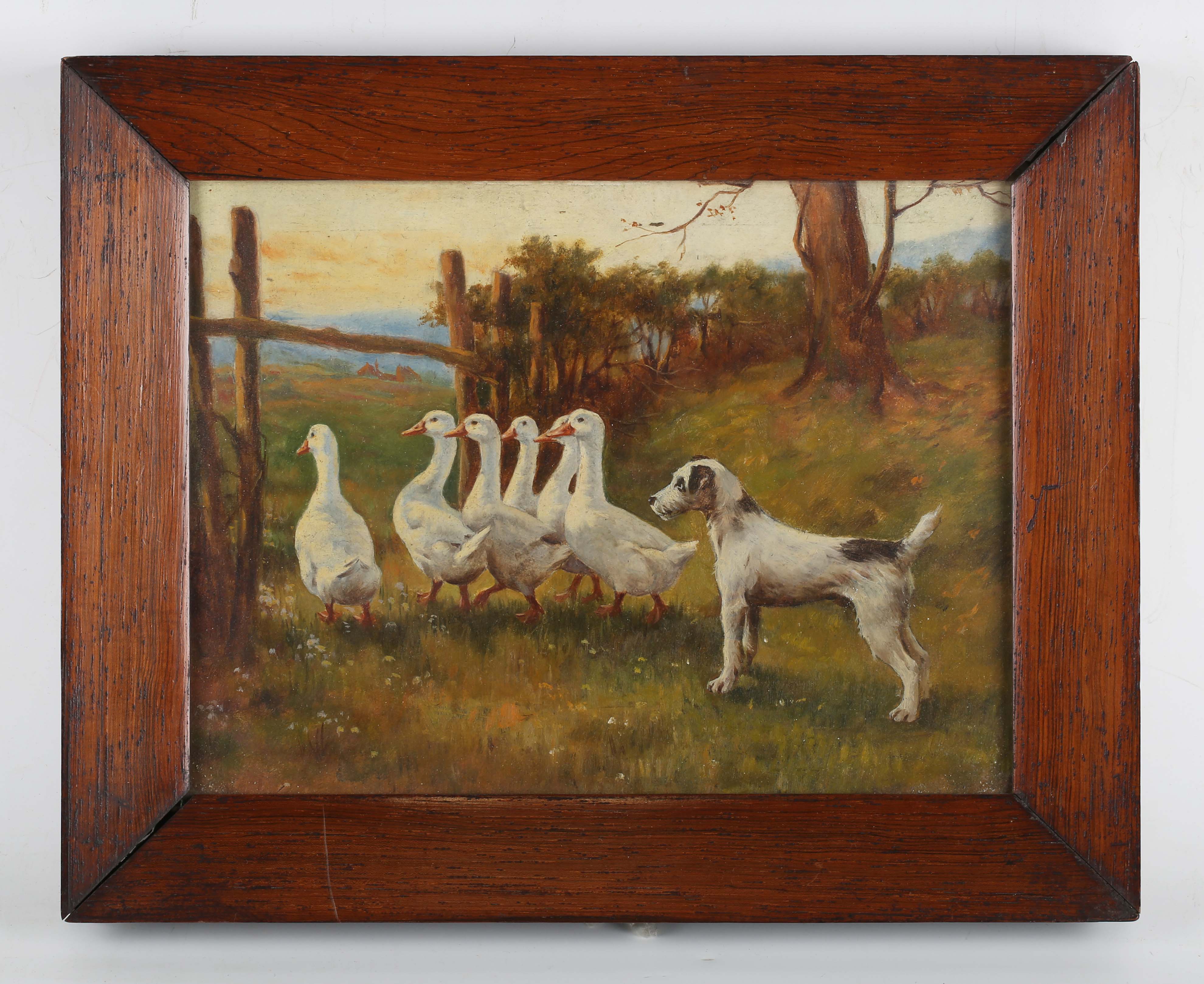 Circle of William Weekes (act.1856-1904) - Dog herding geese, oil on board, 19cm x 25cm, within a mahogany veneered frame.