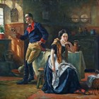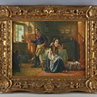 Manner of William Henry Midwood (British act.1867-1871) - Pensive thoughts: interior scene with a couple, 20th century oil on board, bears indistinct signature lower right, 30cm x 40cm, within a swept gilt composition frame.