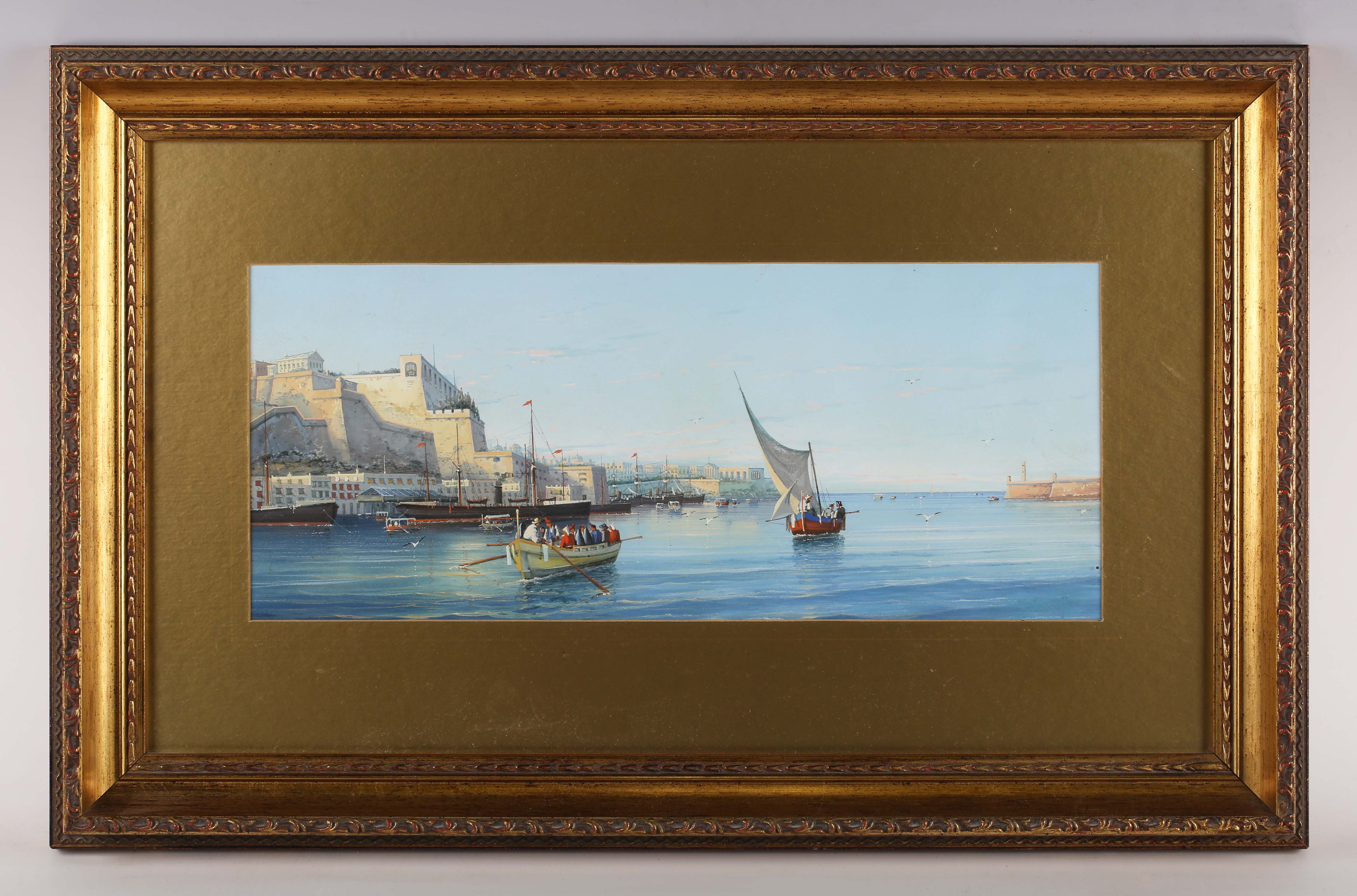 M. Gianni (Maltese early 20th century) - ‘The Grand Harbour, Valetta, Malta’, gouache, bears inscription verso, 17cm x 40cm, within a gilt frame.