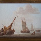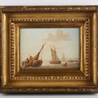 British School (early 19th century) - Beach scene with figures and beached boats, oil on panel, 18.5cm x 27cm, within a gilt composition frame of deep section with egg and dart moulding.