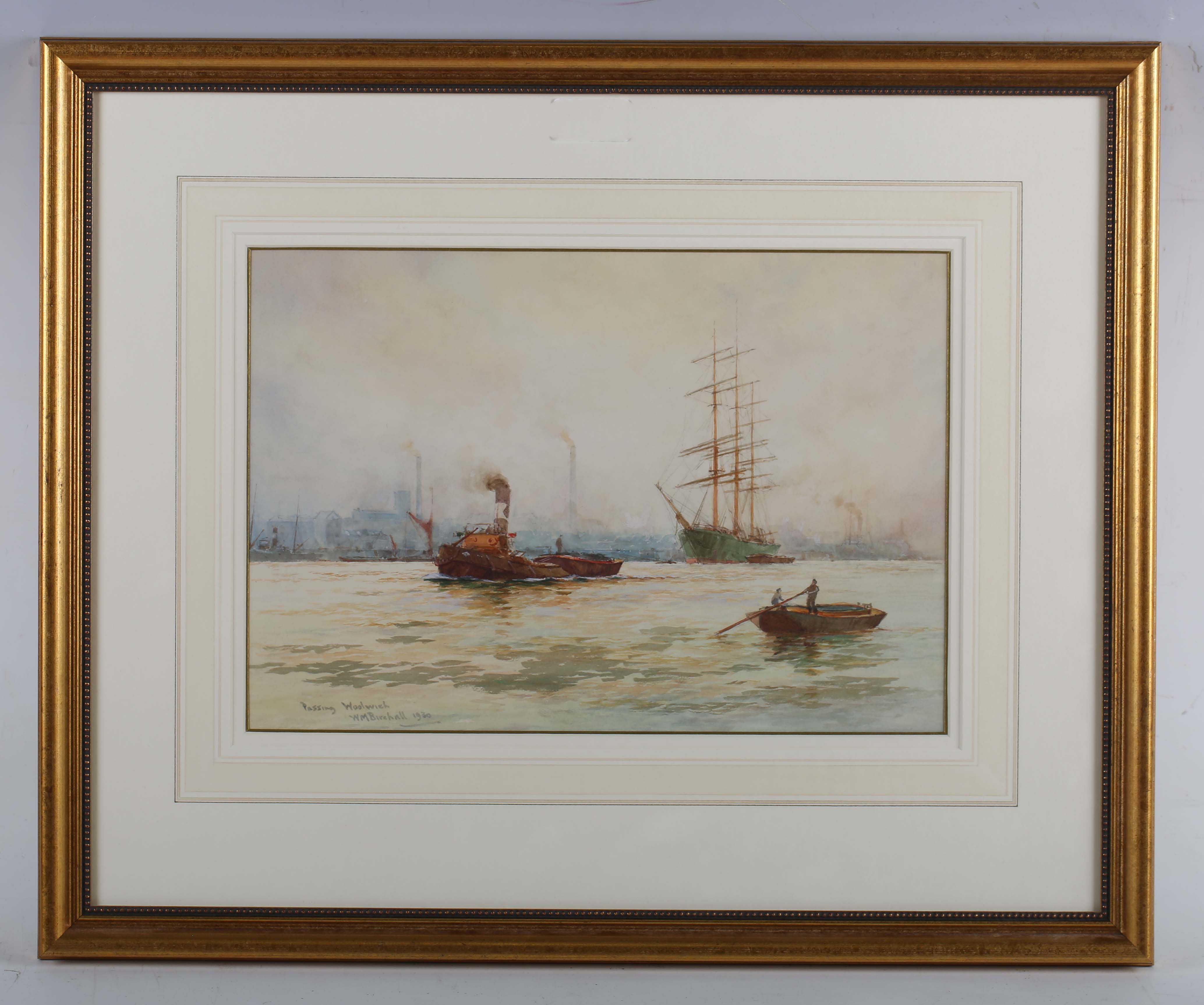 William Minshall Birchall (British 1884-1941) - 'Passing Woolwich', watercolour, signed, inscribed and dated 1930 lower left, 24cm x 35cm, within a gilt frame.