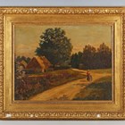Elliot E. Brooks (British late 19th/early 20th century) - Landscape with mother and child on a country lane, oil on canvas, signed lower right, inscribed on label verso, 37cm x 45.5cm, within a Watts style gilt composition frame.