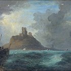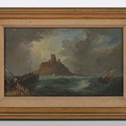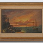 Follower of William Clarkson Stanfield (British 1793-1867) - Coastal island, possibly St Michael’s Mount; Harbour scene with shipping, a pair, oil on board, both bear inscriptions verso, each 11.5cm x 19cm, within gilt frames and linen-lined slips, together with a further oil landscape at sunset by another hand (3).