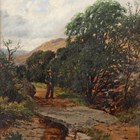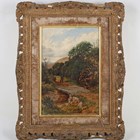 Charles Blacklock (British d.1893) - 'Near Bettws-y-Coed': landscape with fisherman approaching a river crossing, oil on board, signed and dated 1878 lower right, 25cm x 16cm, within a gilt composition frame.