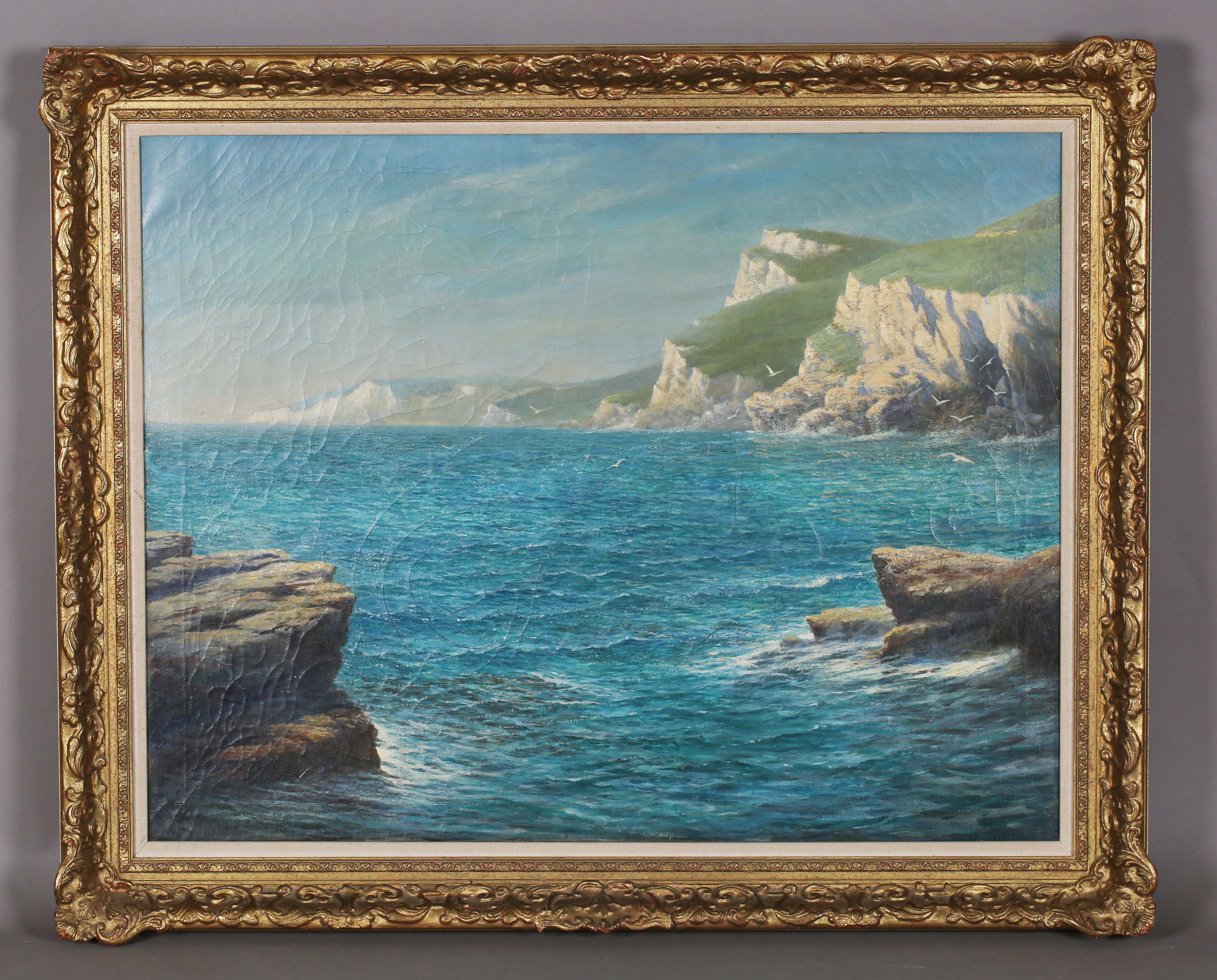 ** Wade (early 20th century) - Rocky coastal scene, oil on canvas, signed lower left, 71cm x 91cm, within a gilt composition frame of foliate design.