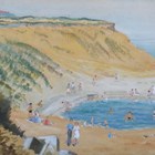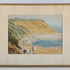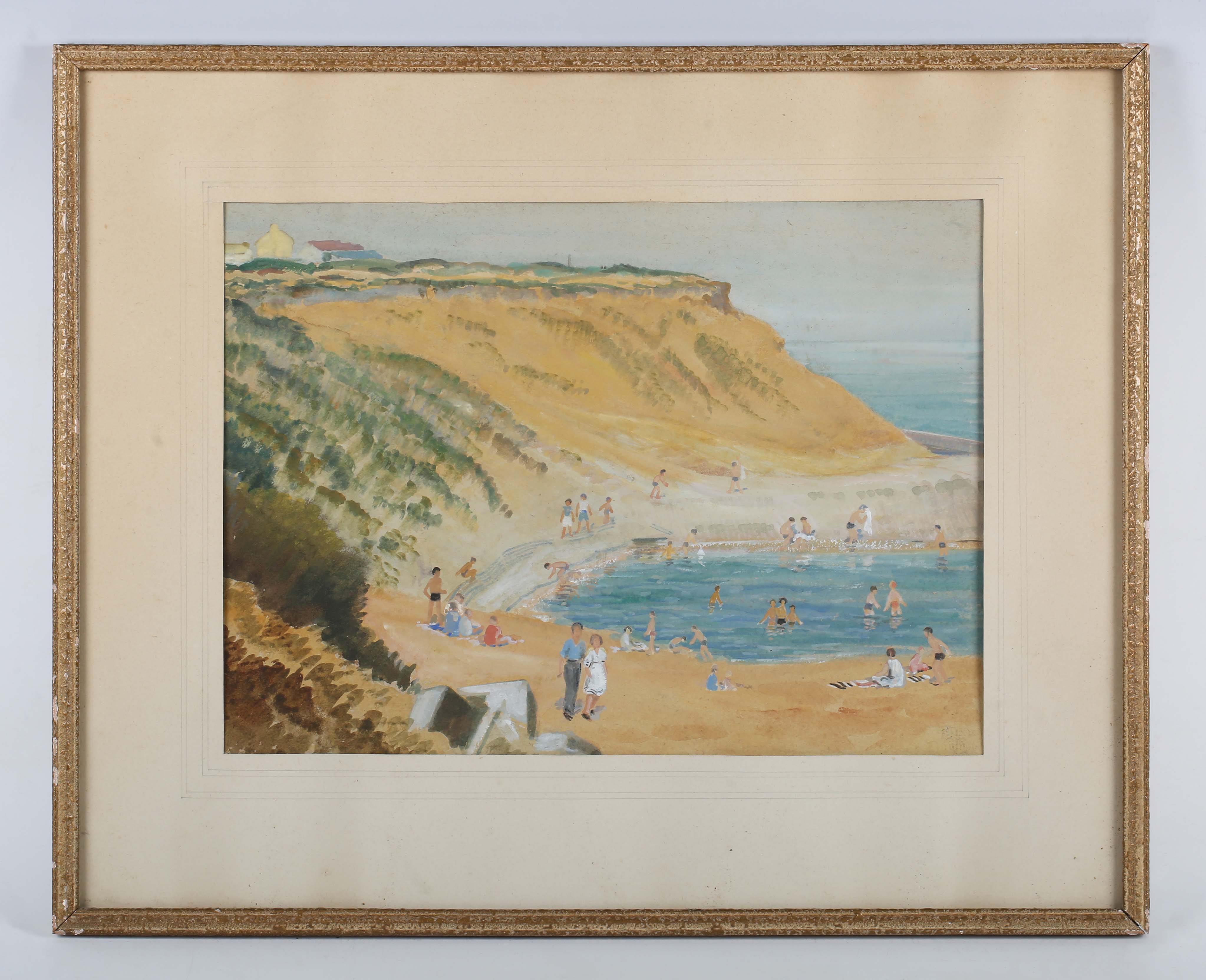 English School (20th century) - Beach scene with figures, watercolour and bodycolour, 27cm x 36.5cm, within a painted frame.