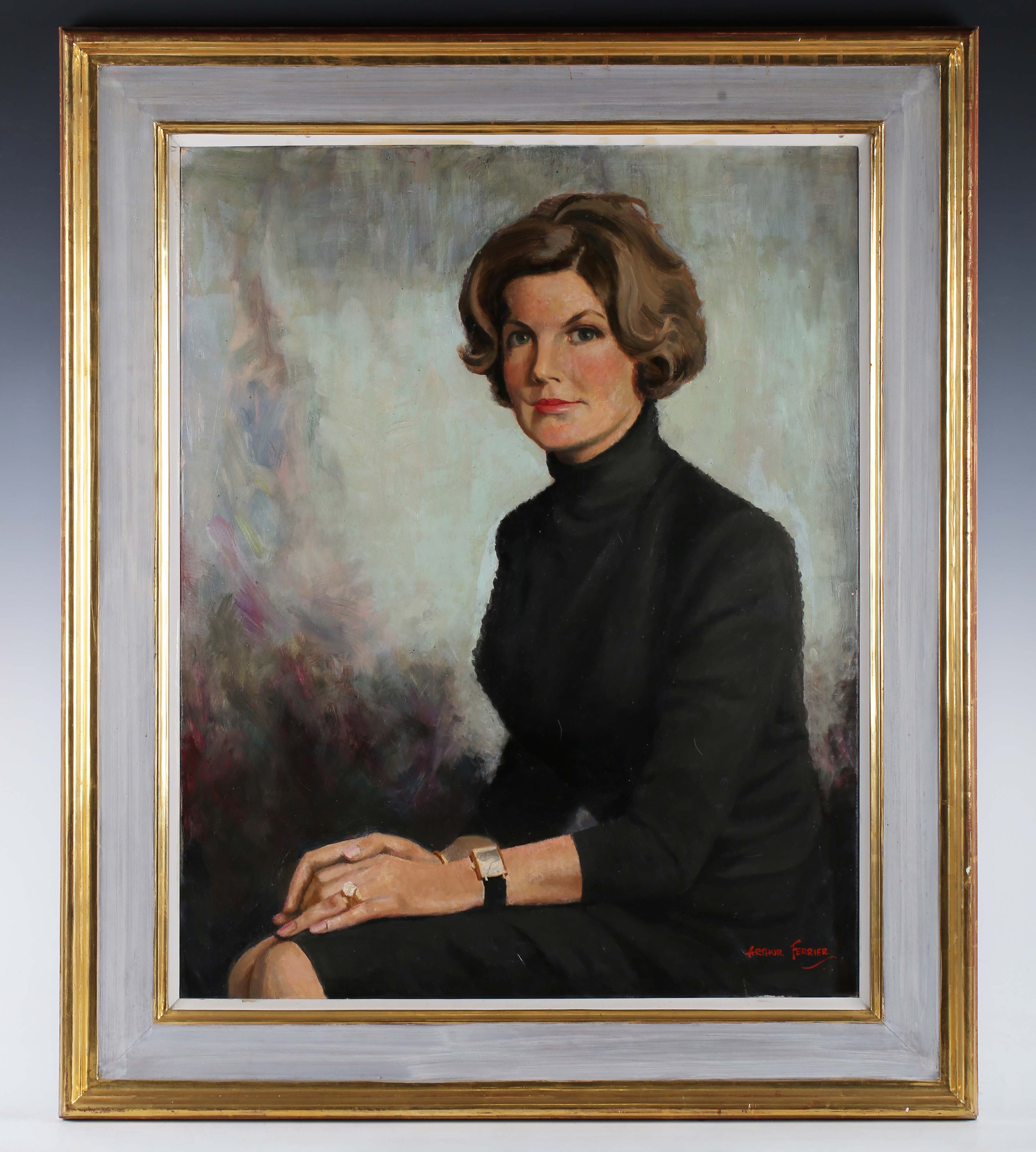Arthur Ferrier (British 1890-1973) - Three-quarter length portrait of a lady, seated, wearing a black polo neck sweater, oil on canvas, signed lower right, 76cm x 60.5cm, within a gilt and painted frame.