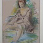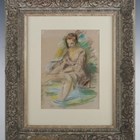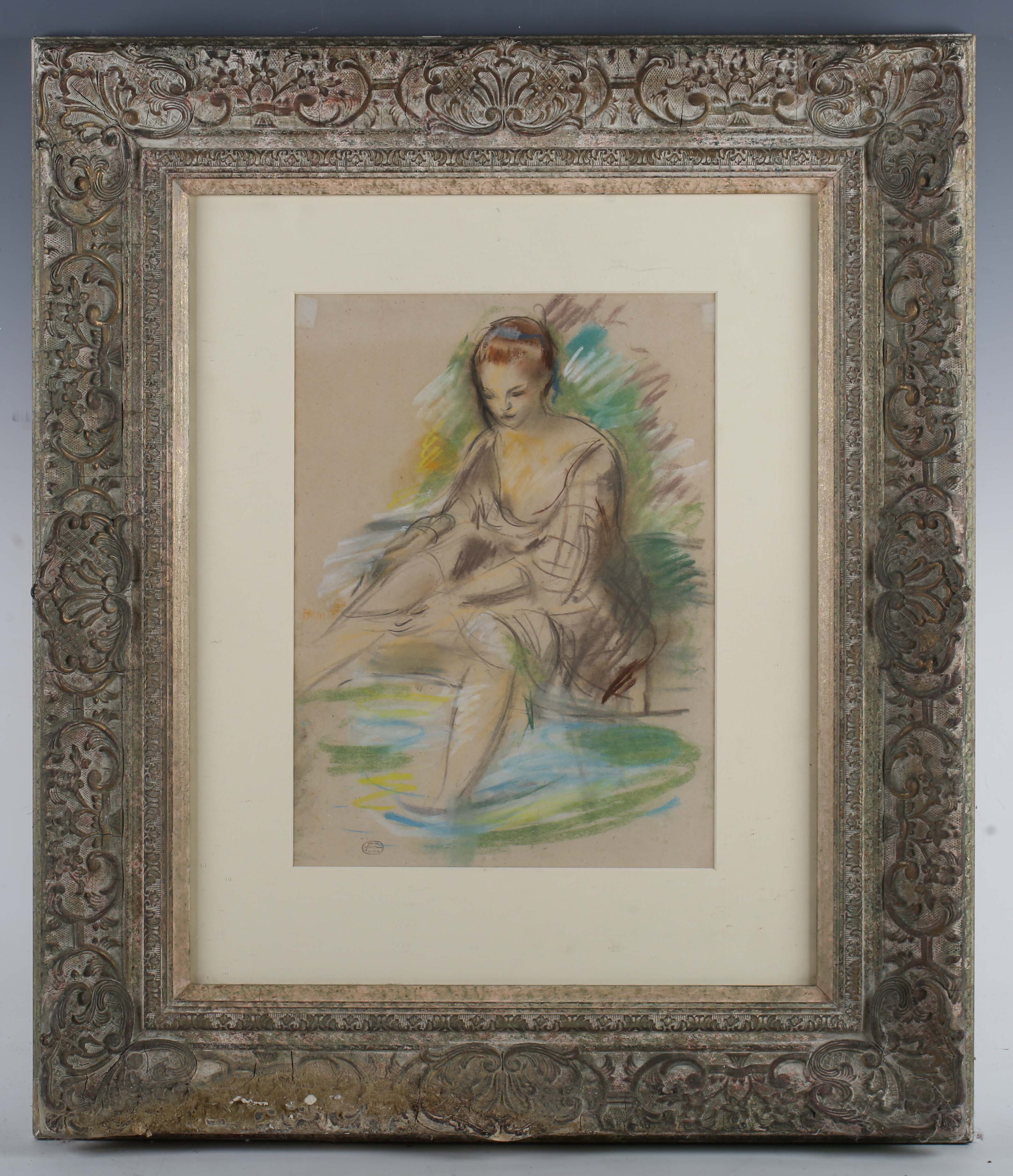 Renata Gross (20th century) - Seated female figure, coloured chalks, bears atelier stamp lower left, 36cm x 26cm, within a swept painted composition frame.