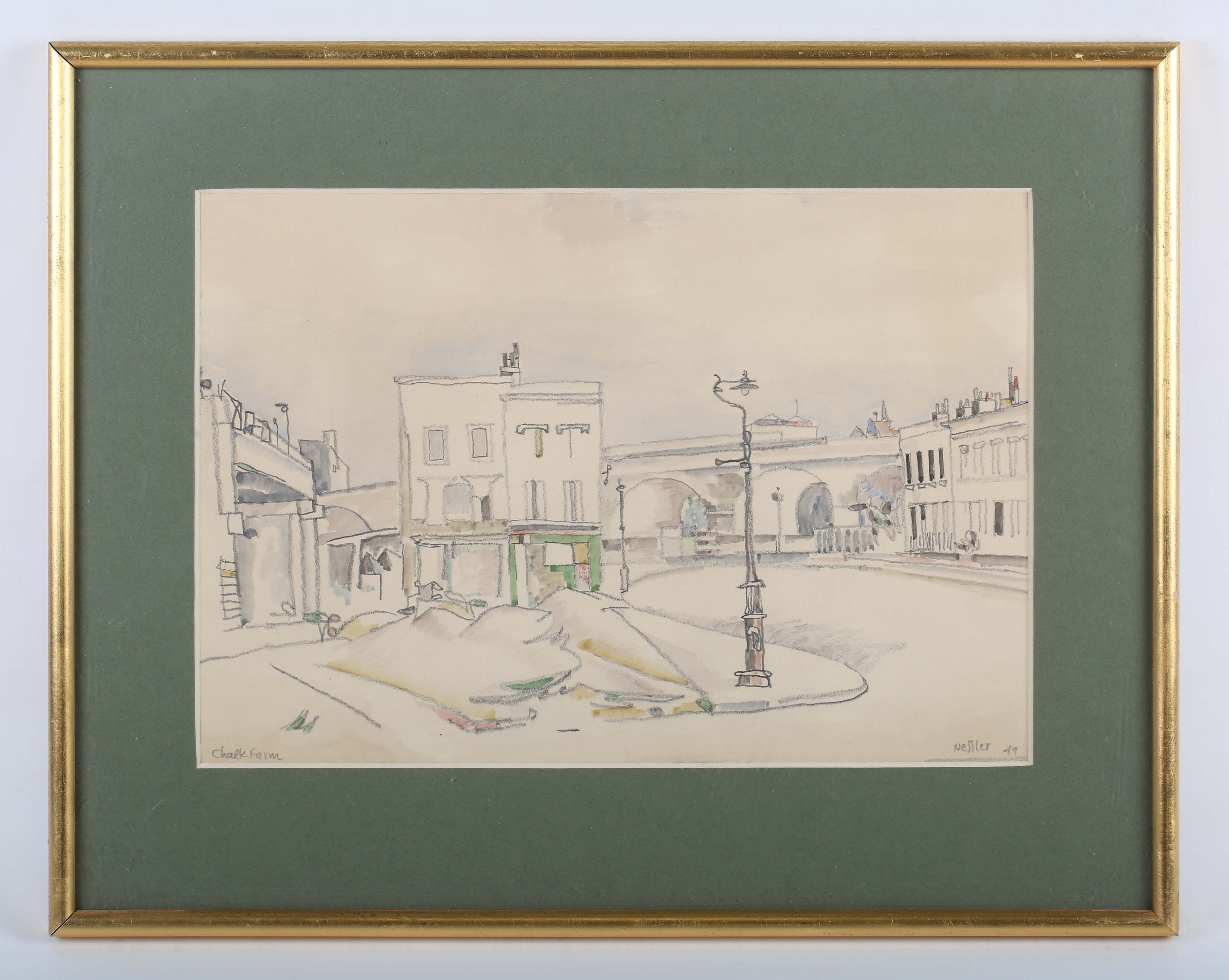 Walter Horst Nessler (German 1912-2001) - 'Chalk Farm', watercolour and pencil, signed and dated ’49 lower right, titled lower left, 22cm x 32cm, together with a further watercolour over pencil by the same hand, 'Bayeux', signed, dated ’48 and titled, 22.5cm x 32.5cm, both within gilt frames (2).