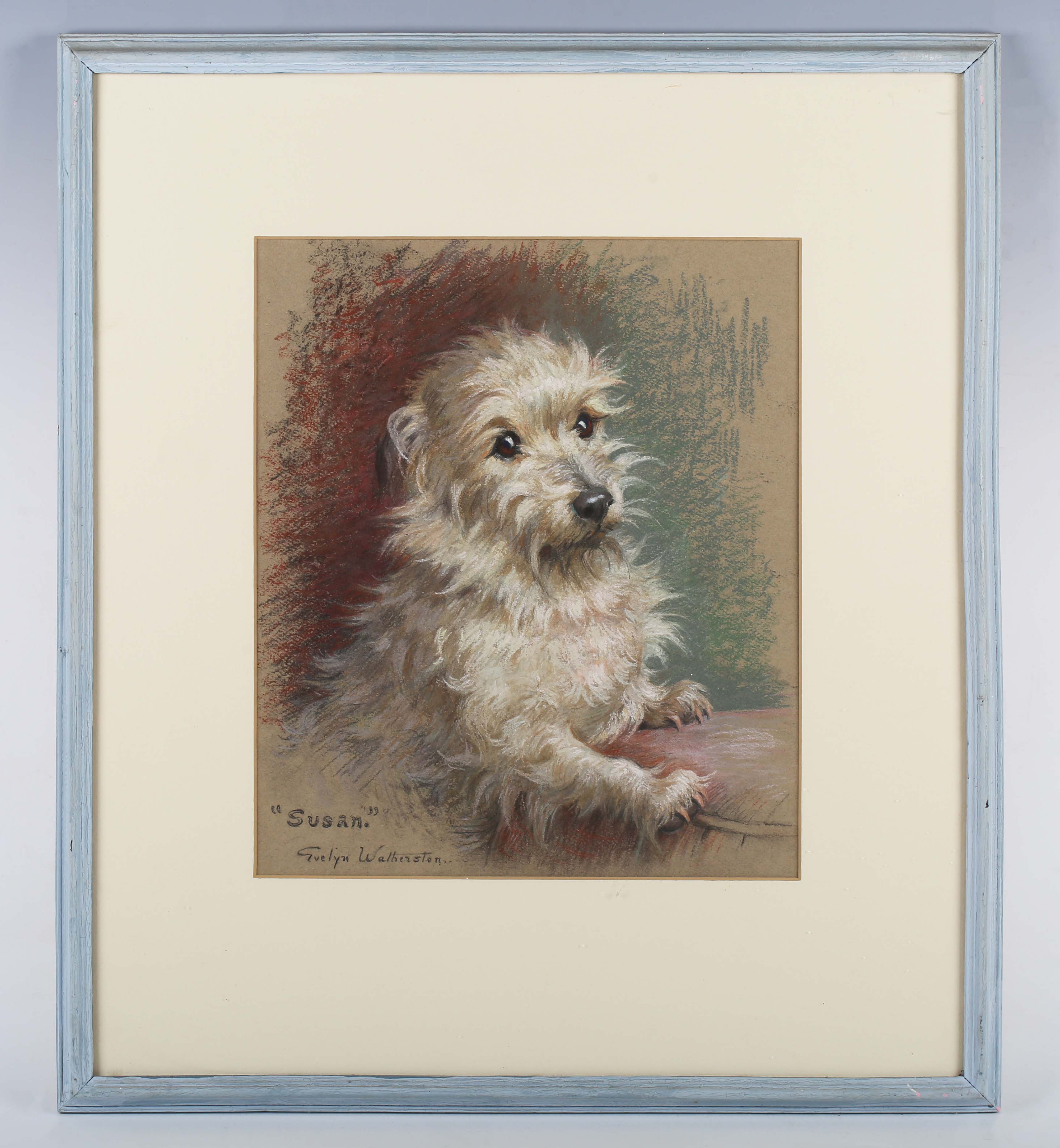 Evelyn Weatherston (British 20th century) - ‘Susan’; ‘Carey’: studies of wire hair Jack Russell dogs, two, pastel, both signed and inscribed, one lower left, the other lower right, each 33cm x 27cm, within blue painted frames (2).