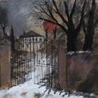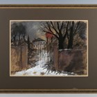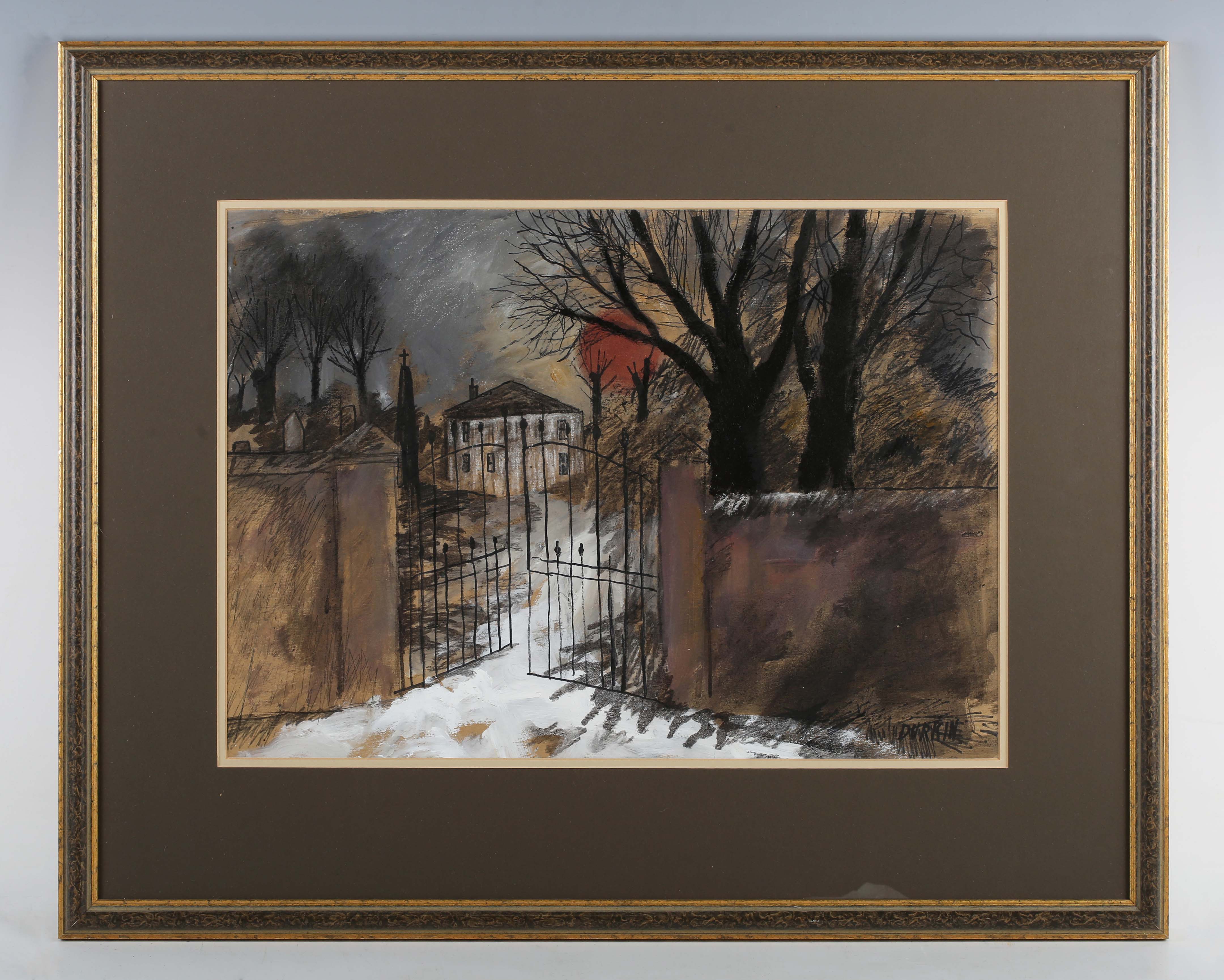 Tom Durkin (British 1928-1990) - Gateway to a house in winter, probably Haworth, Yorkshire, gouache and mixed media, signed lower right, 35cm x 48cm, within a gilt and painted frame.