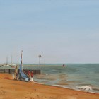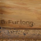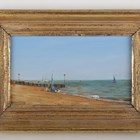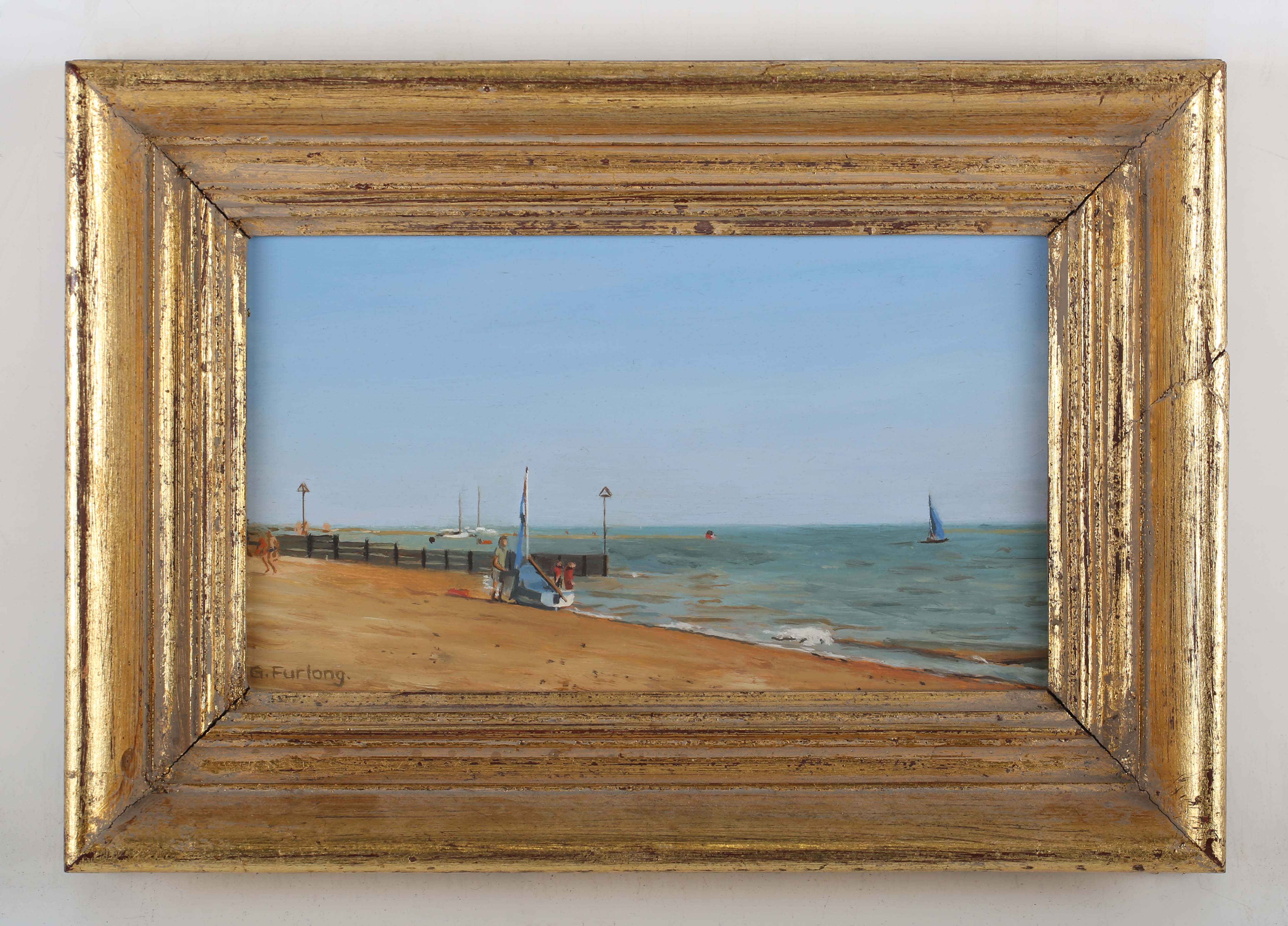 Gillian M. Furlong (British late 20th century) - Coastal scene with figures by a dinghy on the shore, oil on board, signed lower left, inscribed verso, 13cm x 20cm, within a gilt frame.