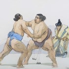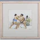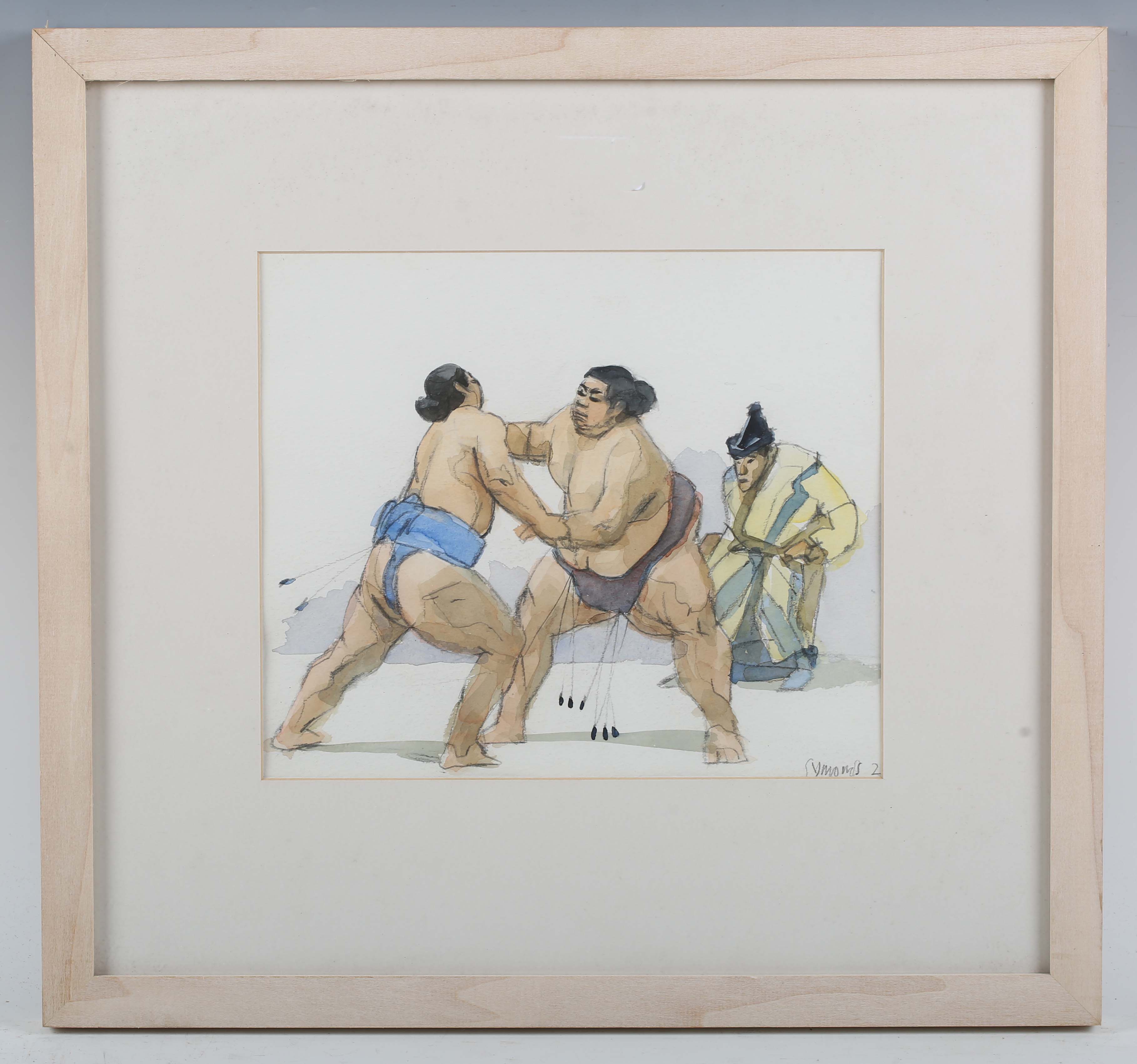 Ken Symonds (British 1927-2010) - ‘Sumo Wrestlers 2’, watercolour over pencil, signed lower right, title and labels verso, 22cm x 26cm, within a limed wood frame.